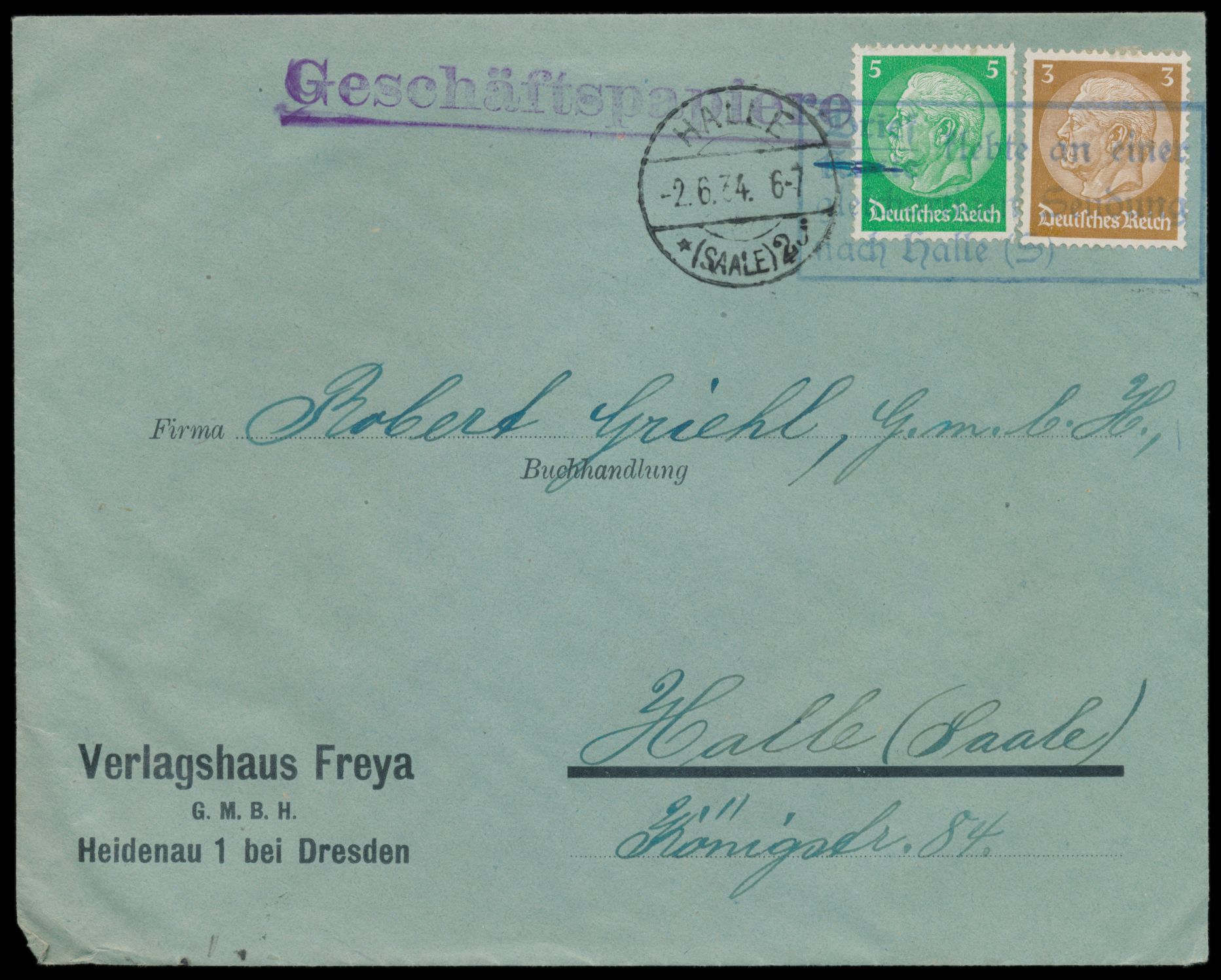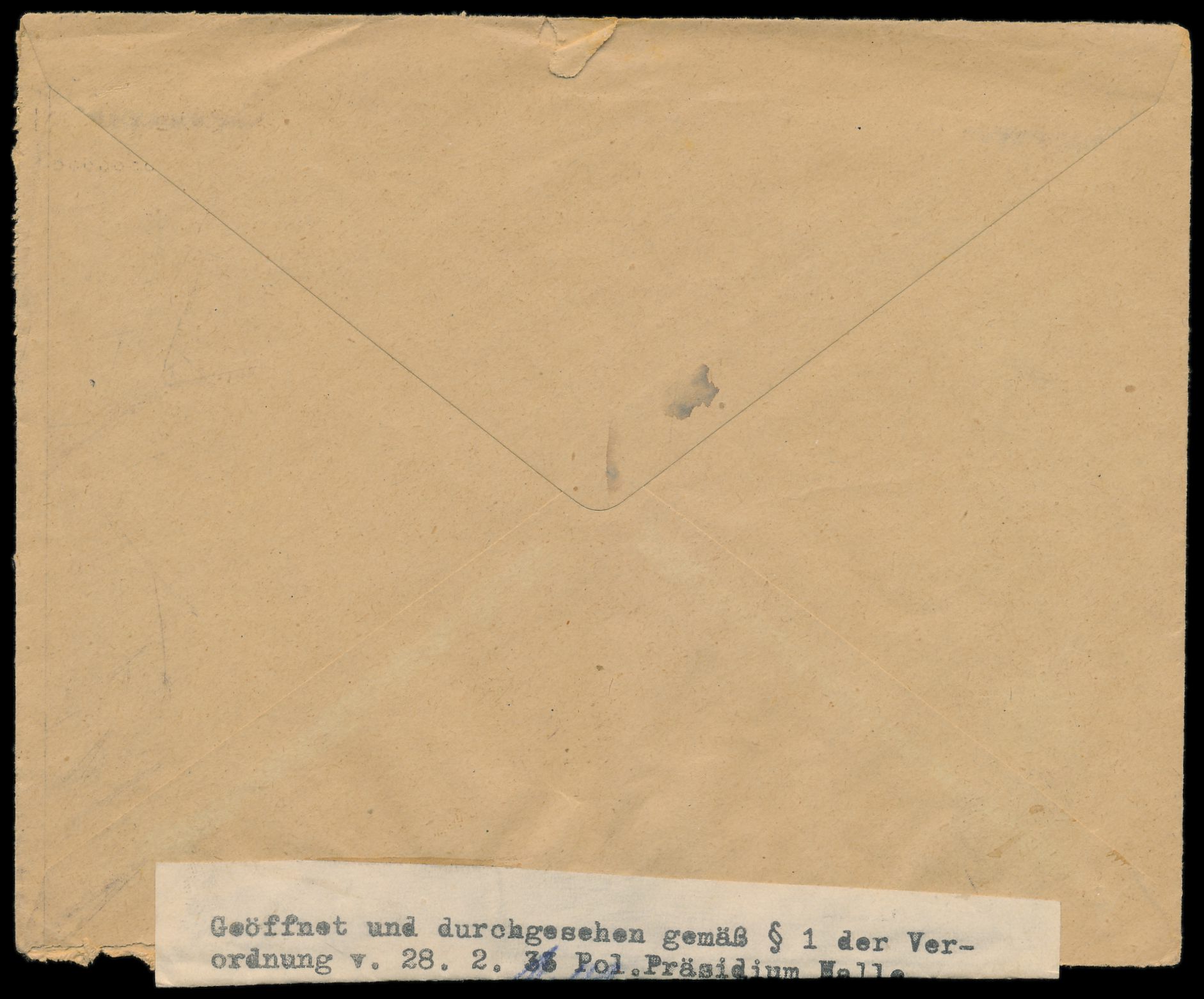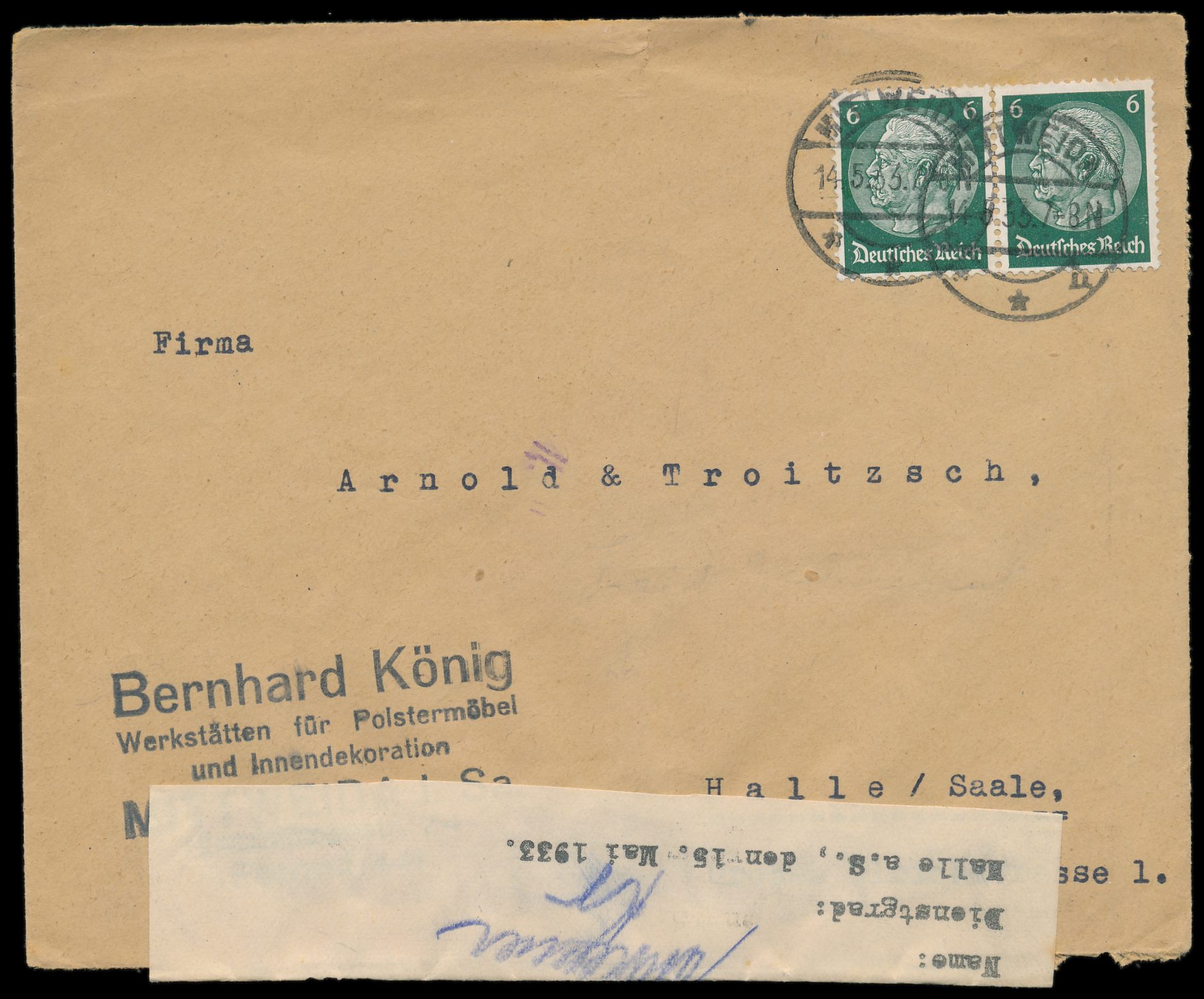2x 6 Pfg. Hindenburg auf Firmenbrief an den Teppich- und Möbelhandel Arnold & Troitzsch in Halle, Stempel Mittweida 14.5.33. Unten Zensurverschluß " Geöffnet und durchgesehen gemäß § 1 der Verordnung v. 28.2.33 Pol. Präsidium Halle, Name: Dienstgrad: Halle a.S. den 15. Mai 1933" mit Unterschrift und Dienstgrad Kr. Die Verordnung des Reichspräsidenten zum Schutz von Volk und Staat setzte die Grundrechte zur Versammlungs- und Pressefreiheit nach dem Reichstagsbrand außer Kraft. Sehr seltene Zensur