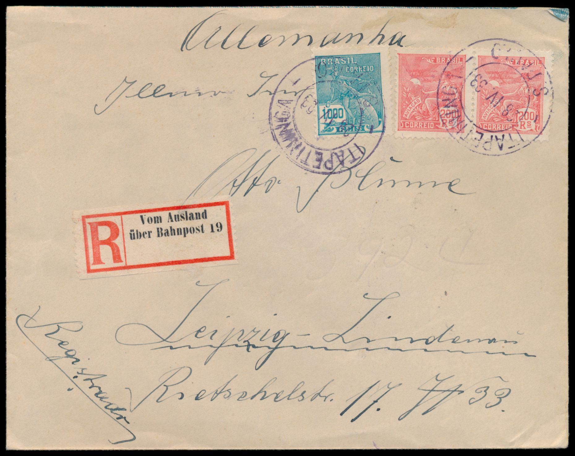 Brasilien 2 x 200 Reis und 1000 Reis auf Einschreibbrief mit Stempel Itapetininga / S. Paulo 28.4.33 nach Leipzig, schwacher handschriftlicher R-Vermerk, R-Zettel "Vom Ausland über Bahnpost 19" , Ankunftstempel 20.5.33, Bedarf