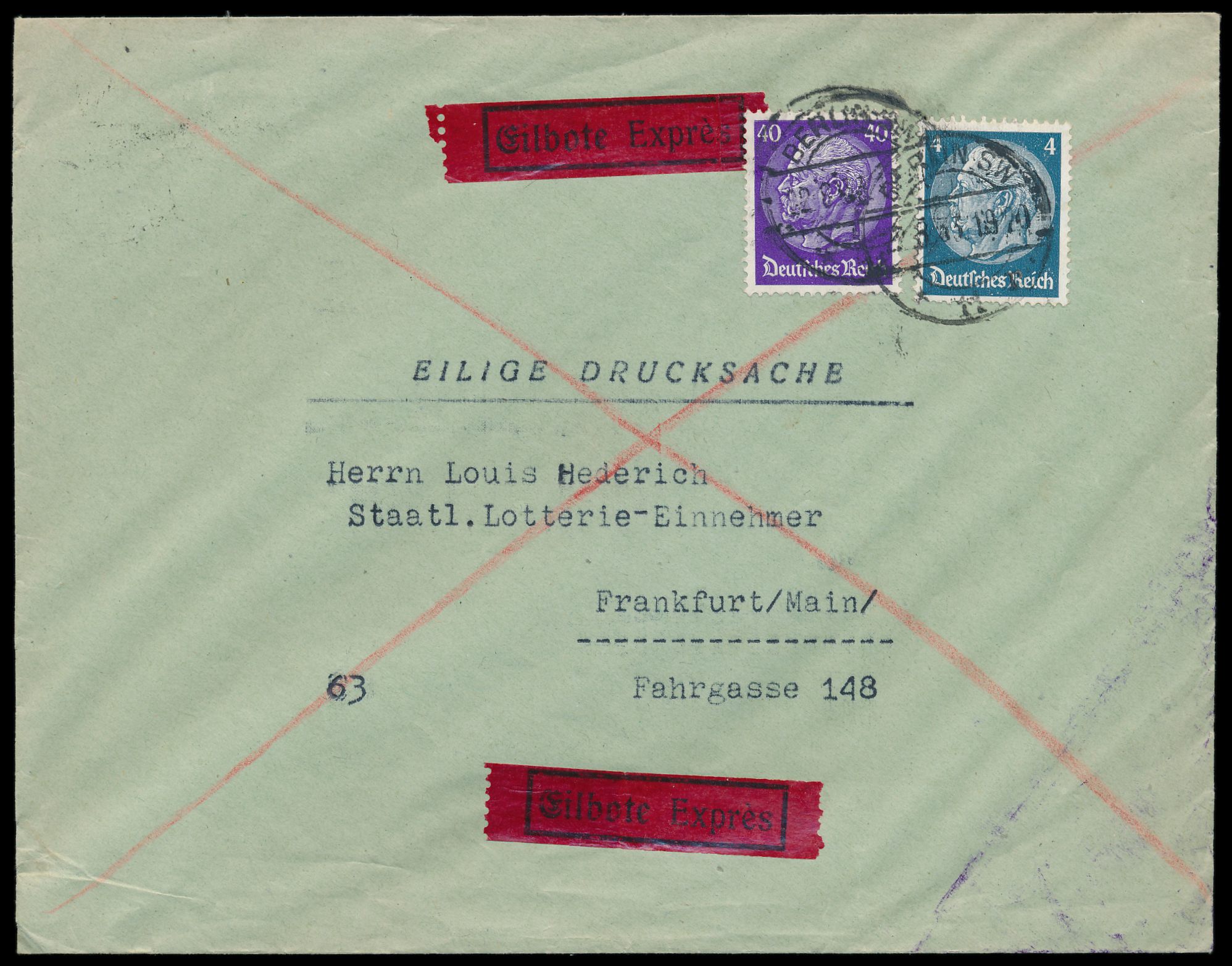 4 Pf. und 40 Pf. Hindenburg auf Eilboten-Drucksache mit Stempel Berlin SW 11 22.8.33 nach Frankfurt / Main, Ankunftstempel 23.8.33, rückseitig Zeilenstempel der Frankfurter Rohrpost, portorichtig, Bedarf