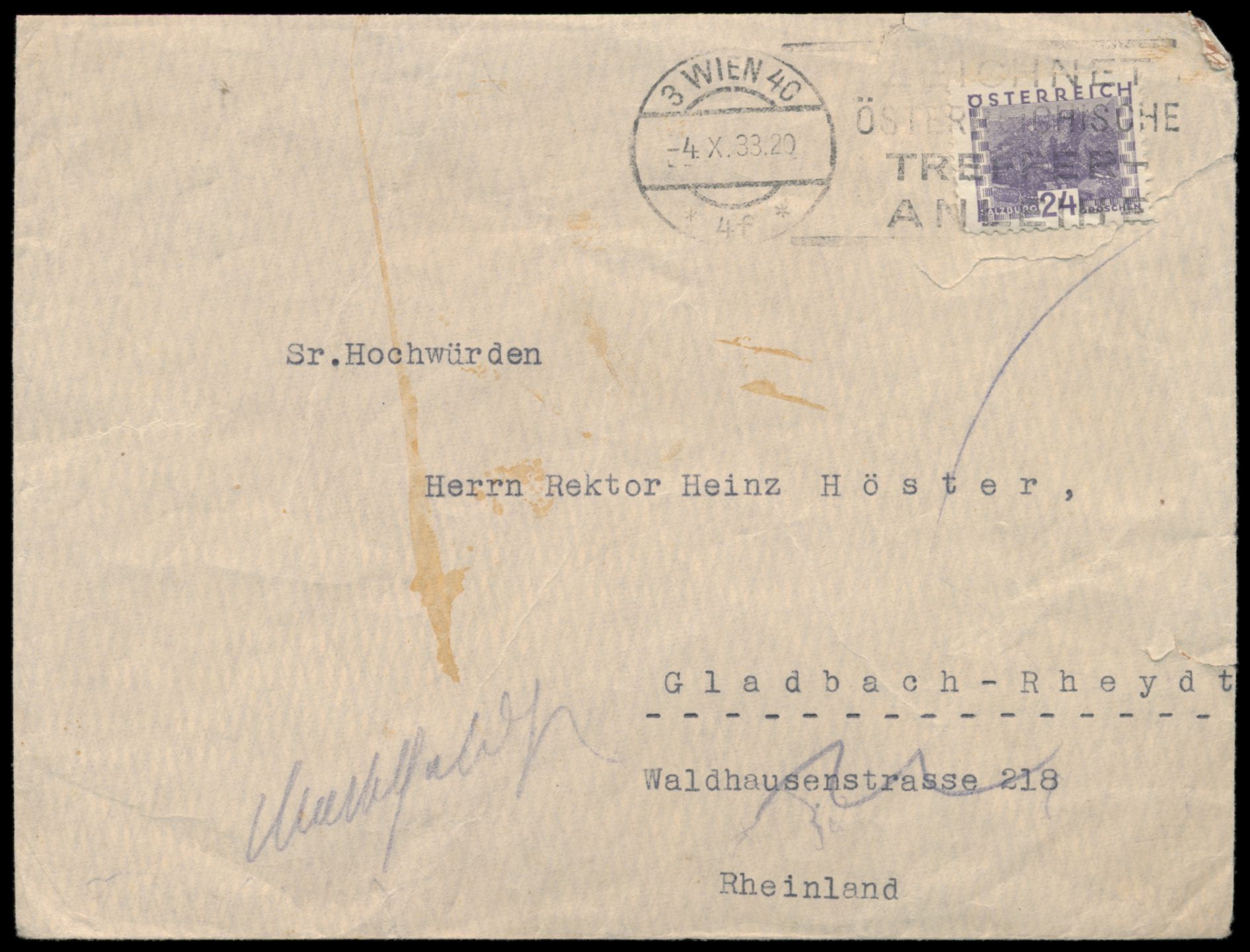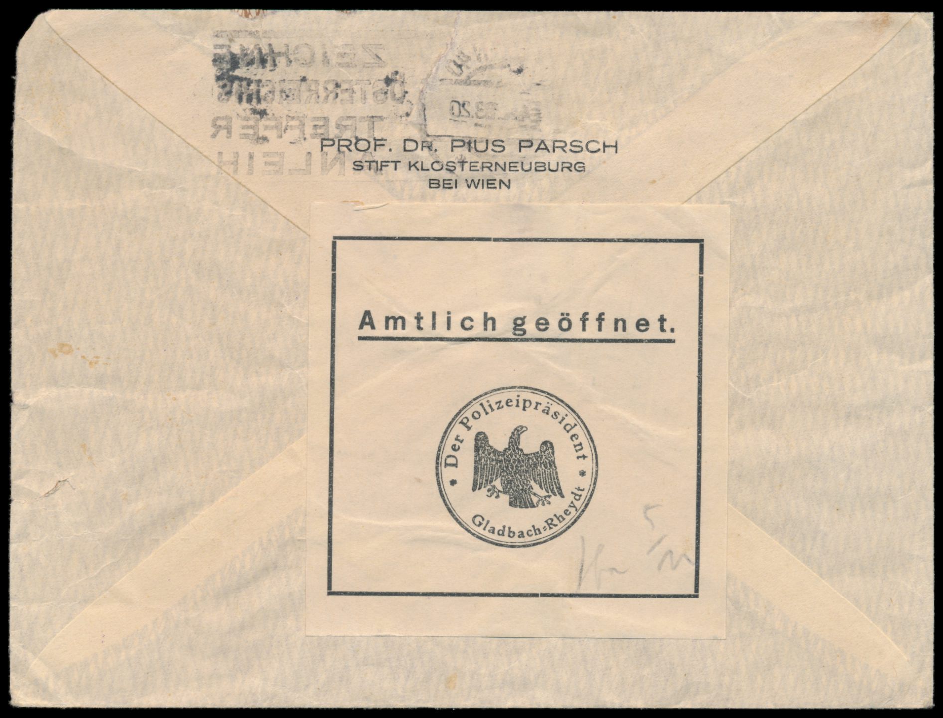 Brief mit Absendereindruck "Prof. Dr. Pius Parsch , Stift Klosterneuburg bei Wien" (bedeutender österr. Theologe), Frankatur Österreich 24 g, Stempel Wien 4.10.33, adressiert an Hochwürden Heinz Höster in Gladbach-Rheydt, rückseitig gedruckter Verschlußzettel Amtlich geöffnet. mit Dienstsiegel Der Polizeipräsident Gladbach-Rheydt, seltene Zensur auf Grund der "Notverordnung zum Schutz von Volk und Staat" als Folge des Reichstagsbrandes am 26.2.1933, Umschlag hat unterhalb der Frankatur 4 cm langen Einriss, Umschlag ist oben ca. 1 cm verkürzt, Beförderungsspuren