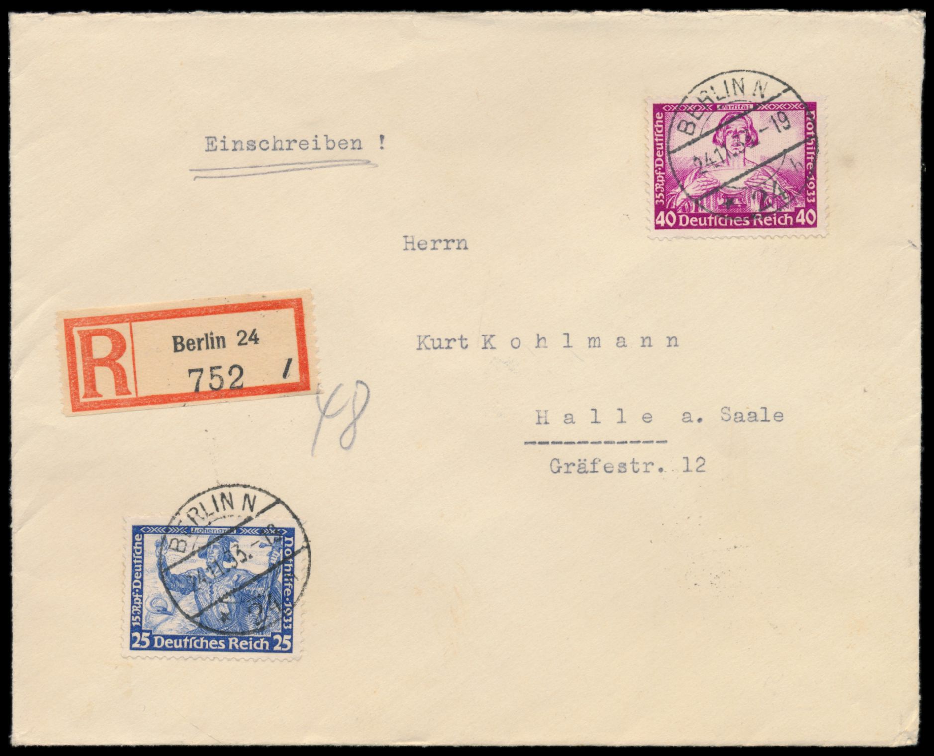25 Pf. und 40 Pf. Wagner auf überfrankiertem Einschreibbrief mit Stempel Berlin N 24 24.11.33 nach Halle, Ankunftstempel 24.11.33