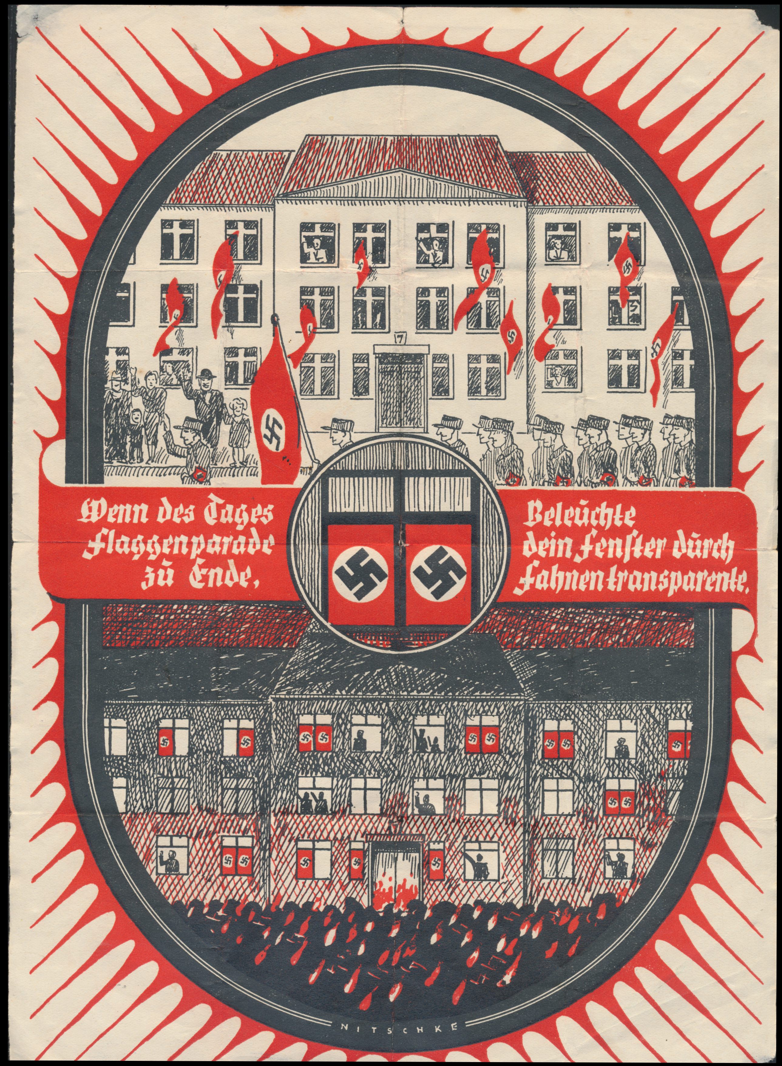 Propaganda-Faltblatt (Format DIN A4) "Wenn des Tages Flaggenparade zu Ende, Beleuchte dein Fenster durch Fahnentransparente" , Entwerfer Nitschke, mehrfach gefaltet, kleine Eckfehler links oben und unten, seltenes Dokument, ca. 1934