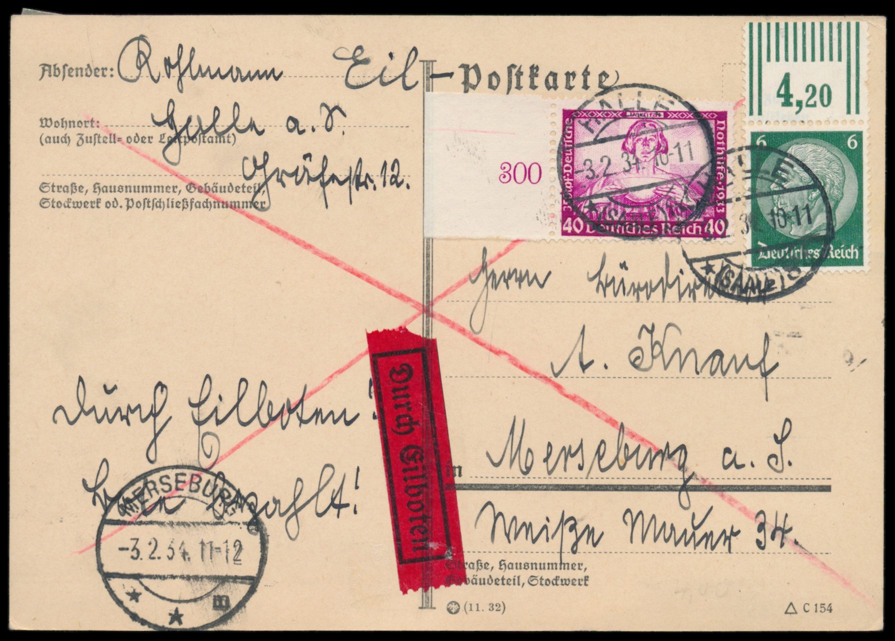 6 Pf. Hindenburg mit Walzendruck-Oberrand und 40 Pf. Wagner mit Seitenrand auf Eilbotenkarte, Stempel Halle (Saale) 8 3.2.34, nach Merseburg, Ankunftstempel 3.2.34, portorichtig, Bedarf