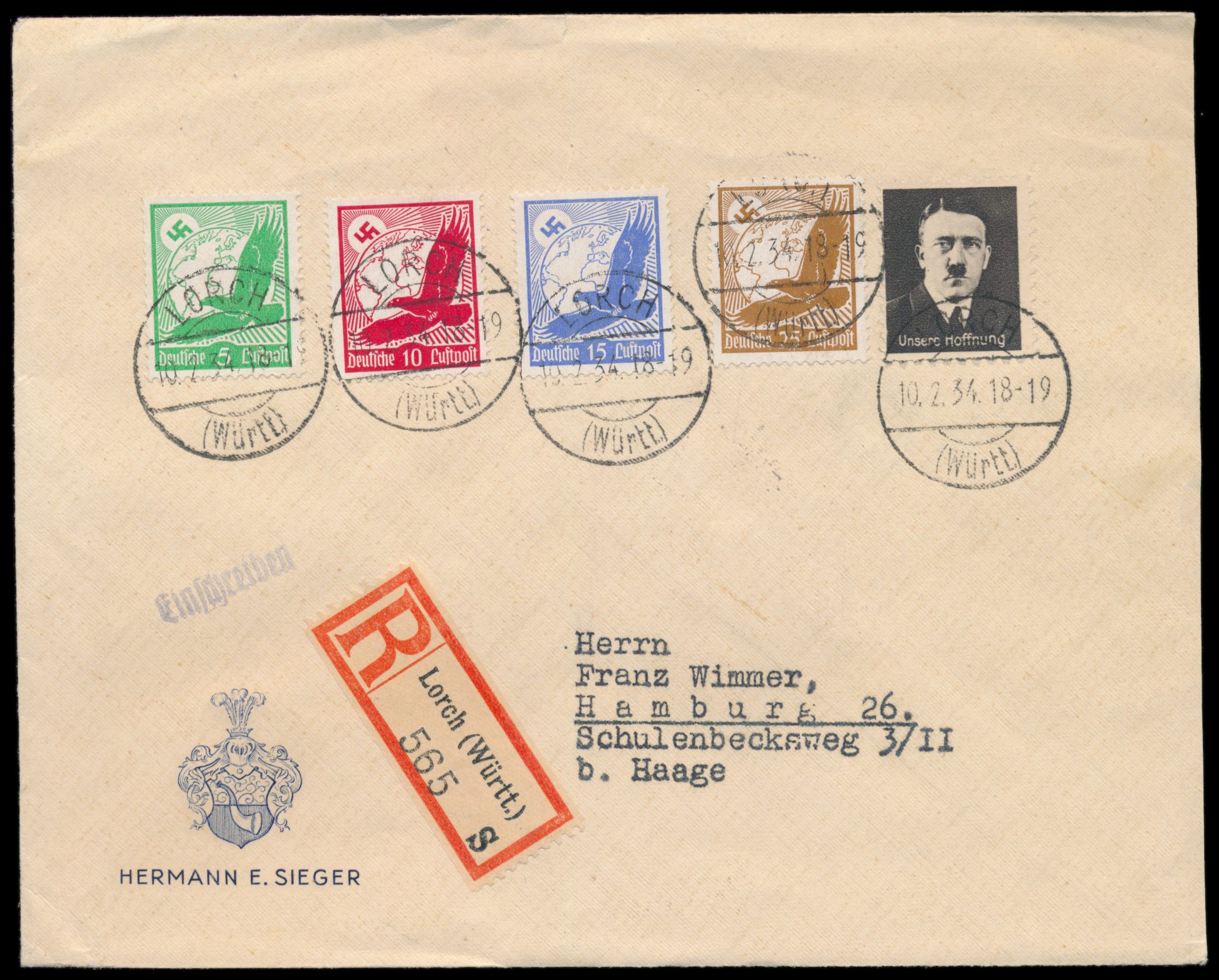 Einschreibbrief 2. Gewicht mit Flugpostmarken-Frankatur 55 Pf. und Hitler-Vignette "Unsere Hoffnung" , Stempel Lorch (Württ.) 10.2.34, nach Hamburg, Ankunftstempel 12.2.34
