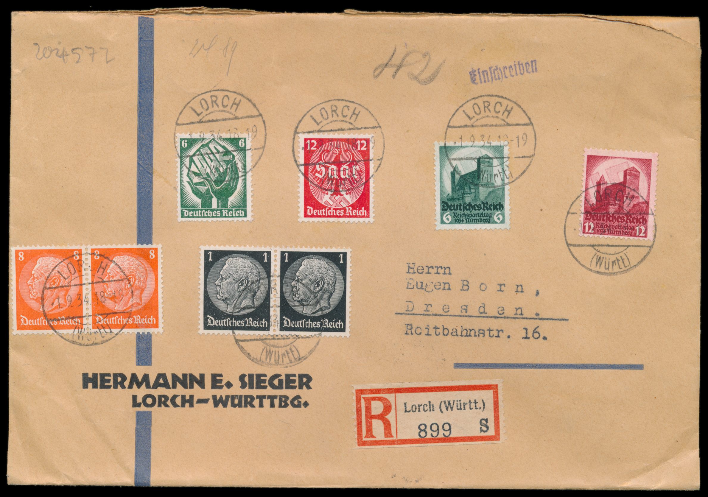 Reichsparteitag Nürnberg 6 Pf. und 12 Pf. mit Ersttagsstempel Lorch 1.9.34 auf Einschreibbrief 2. Gewicht mit weiterer Frankatur nach Dresden, Gesamtfrankatur 54 Pf., portorichtig, Bedarf, MiPr. 400