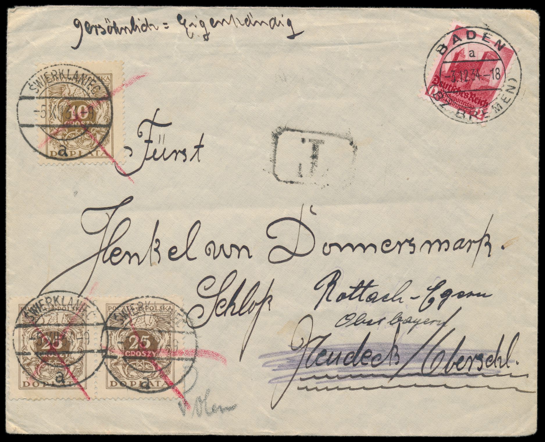 12 Pf. Reichsparteitag auf Brief mit Stempel Baden (Bz. Bremen) 3.12.34 nach Neudeck / Oberschlesien (Polen), unterfrankiert, T.-Stempel, Polen-Portomarken 10 Gr und 2 x 25 Gr frankiert, Stempel Swierklaniec 5.12.34, von dort nach Rottach-Egern nachgesandt, dort keine Nachgebühr erhoben