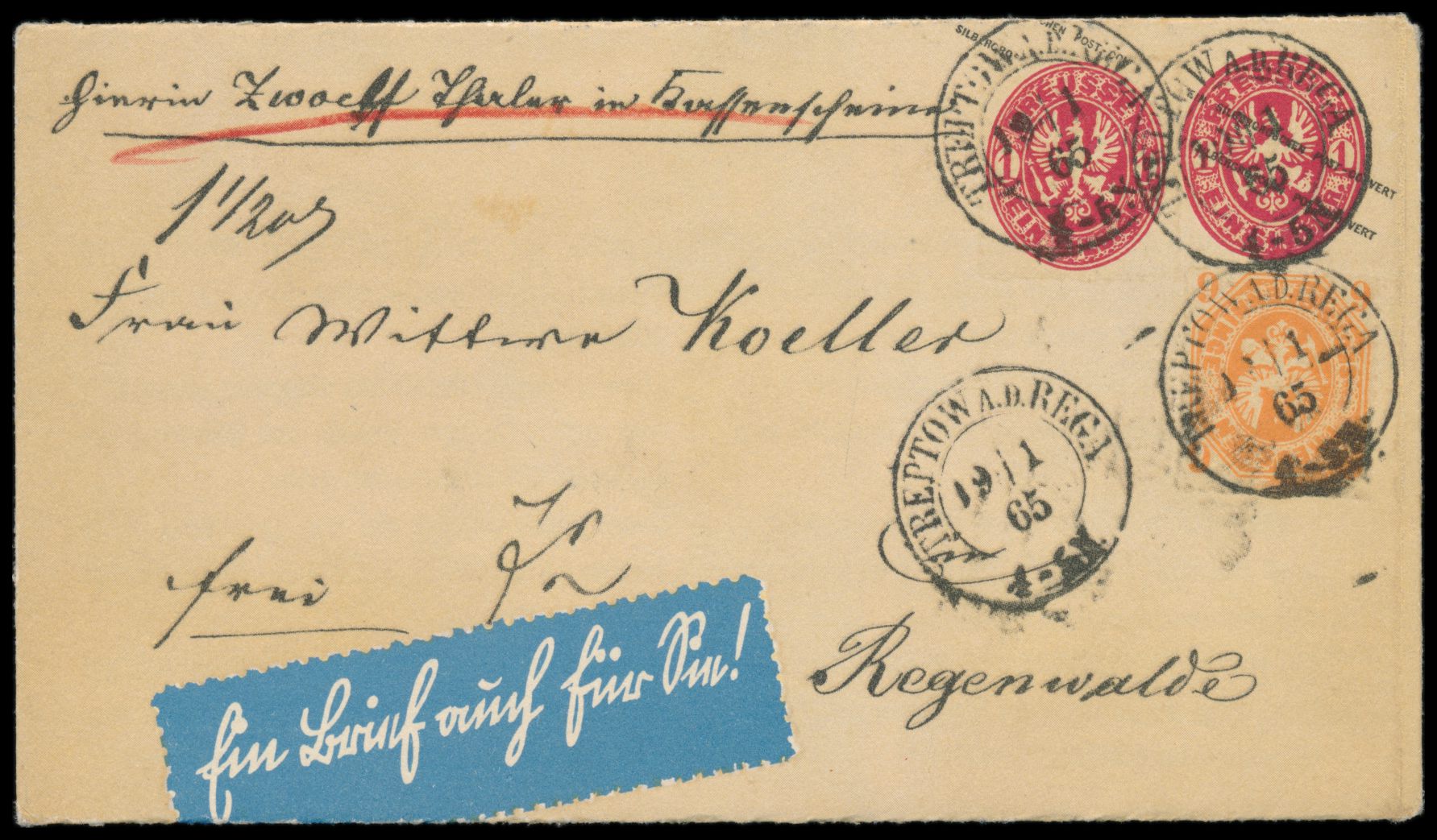Massendrucksache mit Nachdruck eines Wertbriefes mit Preußen-Frankatur und Stempel Treptow a.d. Rega 19.1.65 nach Regenwalde und blauer Zettel "Ein Brief auch für Sie!" seltene, komplett erhaltene Drucksache des Buch- u. Papierhauses, kleine Papieranhaftung rückseitig