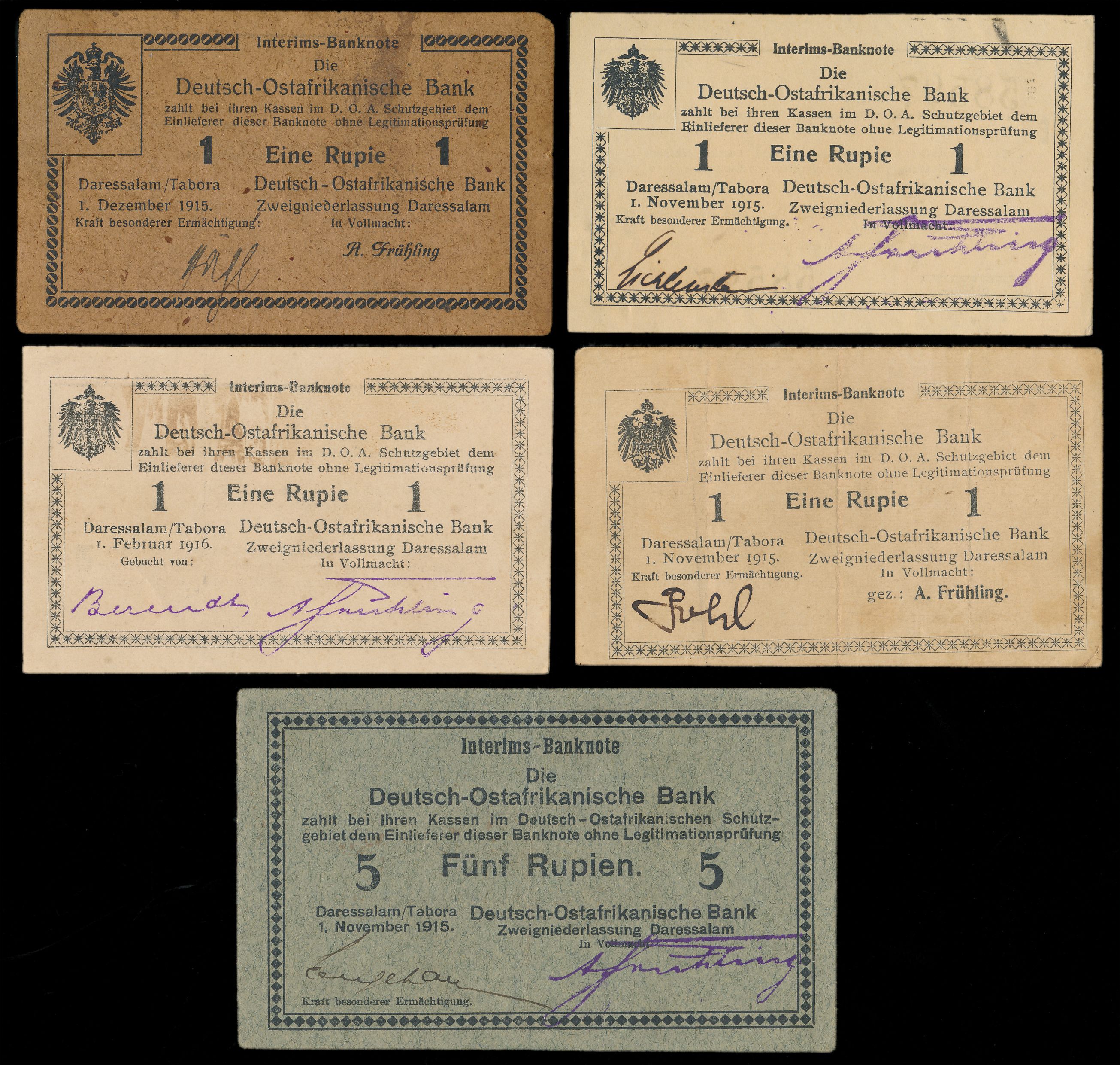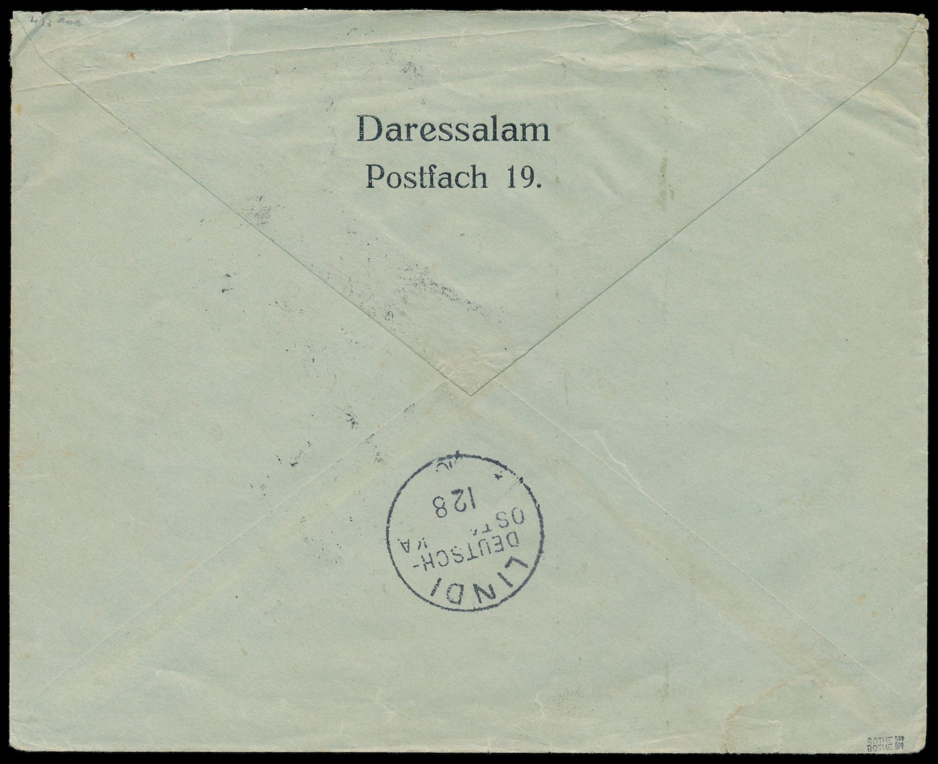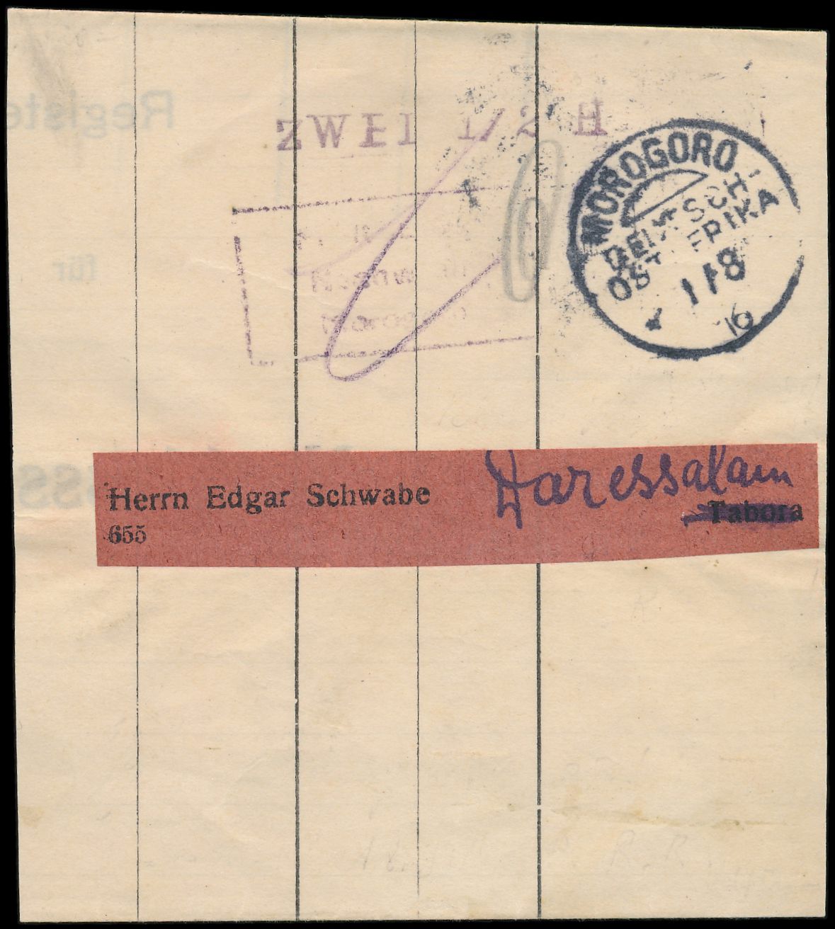 Stempel Morogoro 1.8.16 mit sogenannter "Berliner Jahreszahl" und violetter R3 Fr. lt. Einn. Nachw. in Morogoro mit L1 ZWEI 1/2 H. auf Streifband nach Daressalam