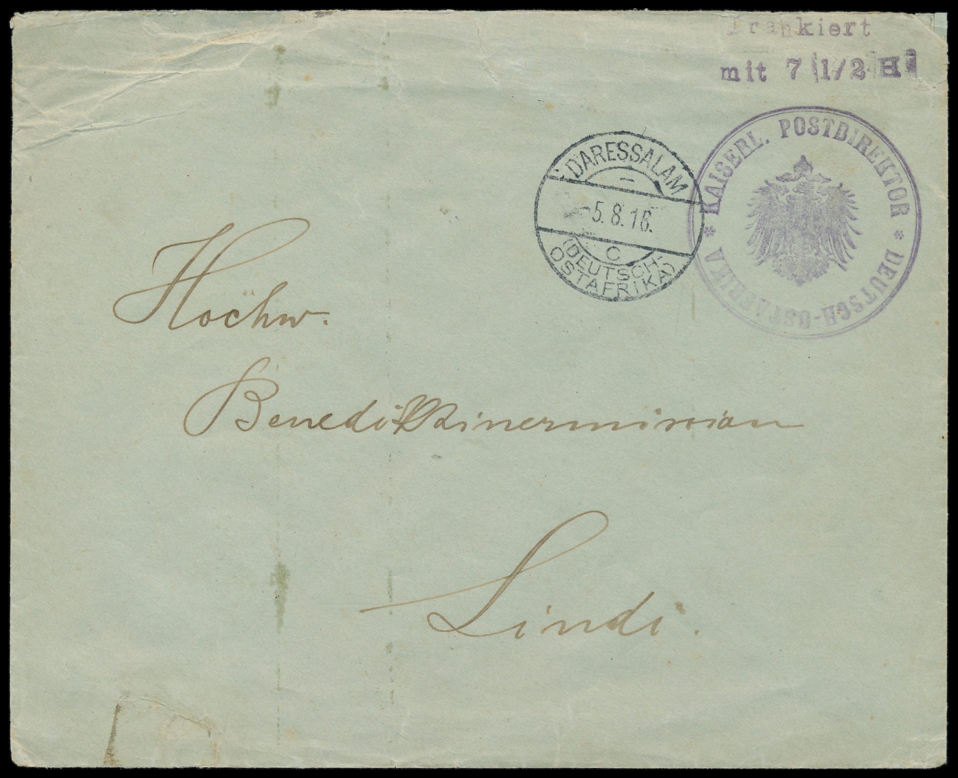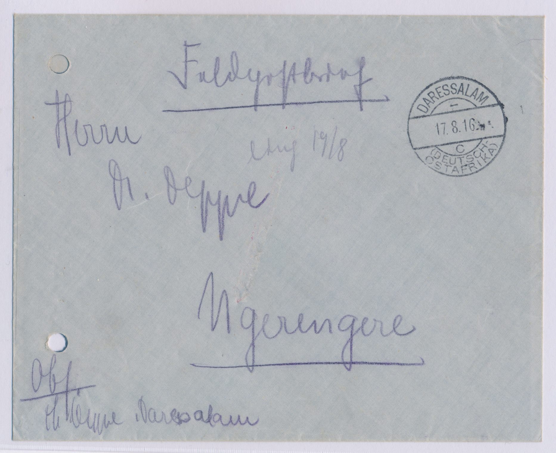 Feldpostbrief mit Stempel Daressalam c 17.8..16 an Dr. Deppe in Ngerengere, handschriftlicher Eingangsvermerk "19.8.", Absender ist Frau Deppe, links Aktenlochung