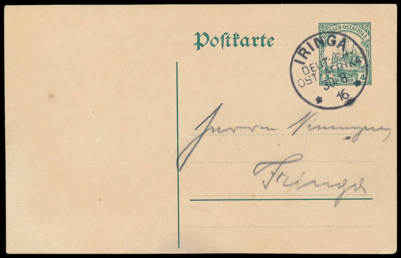Stempel Iringa 30.8.16 mit "Berliner Jahreszahl" , Blank-Abschlag auf Ganzsache 4 H., möglicherweise neuer Letzttag (bisher 20.8.1916)