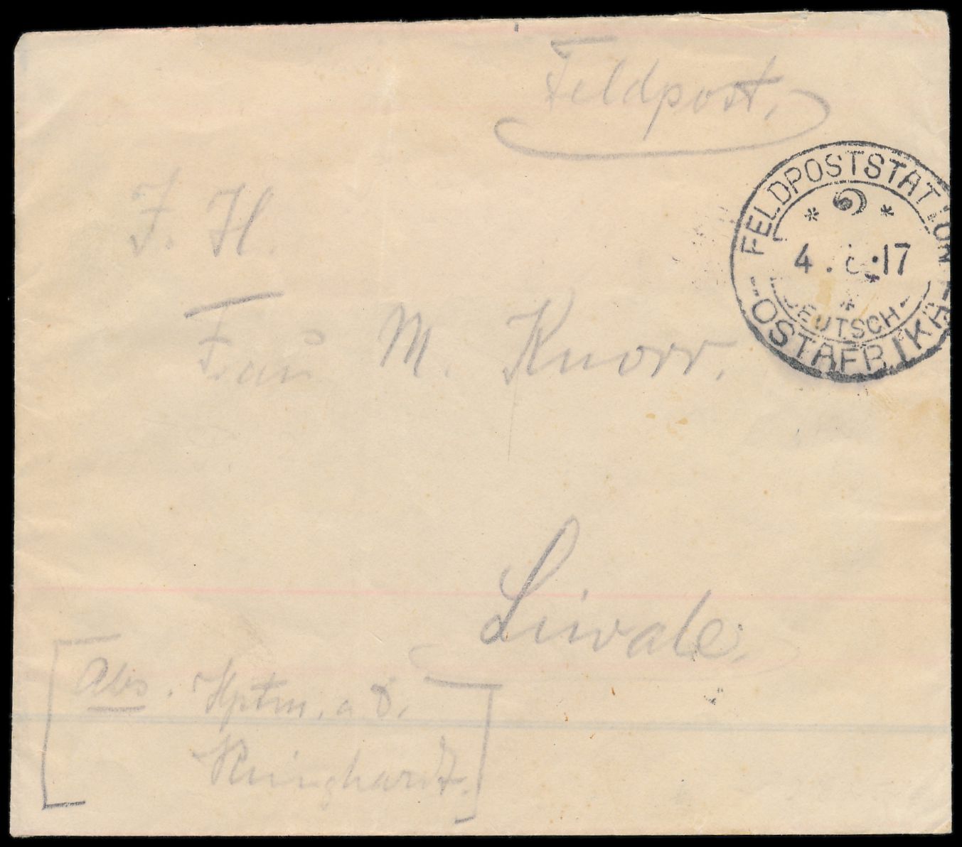 Stempel Feldpoststation 2 4.8.17 in Lukuledi auf kleinem selbstgefertigtem Umschlag nach Liwale, vorderseitig Absender "Hptm. a. D. Klinghardt", Bedarf, signiert Siebentritt BPP