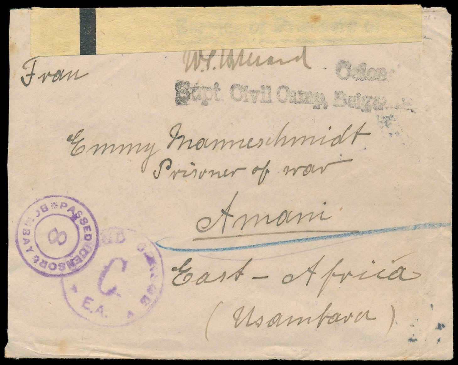 Brief aus dem indischen Internierungslager Belgaum an Emmy Manneschmidt in Amani, Lagerstempel, indische und britische Zensurverschlüsse und -stempel, Durchgangstempel Mombasa 3.11.17