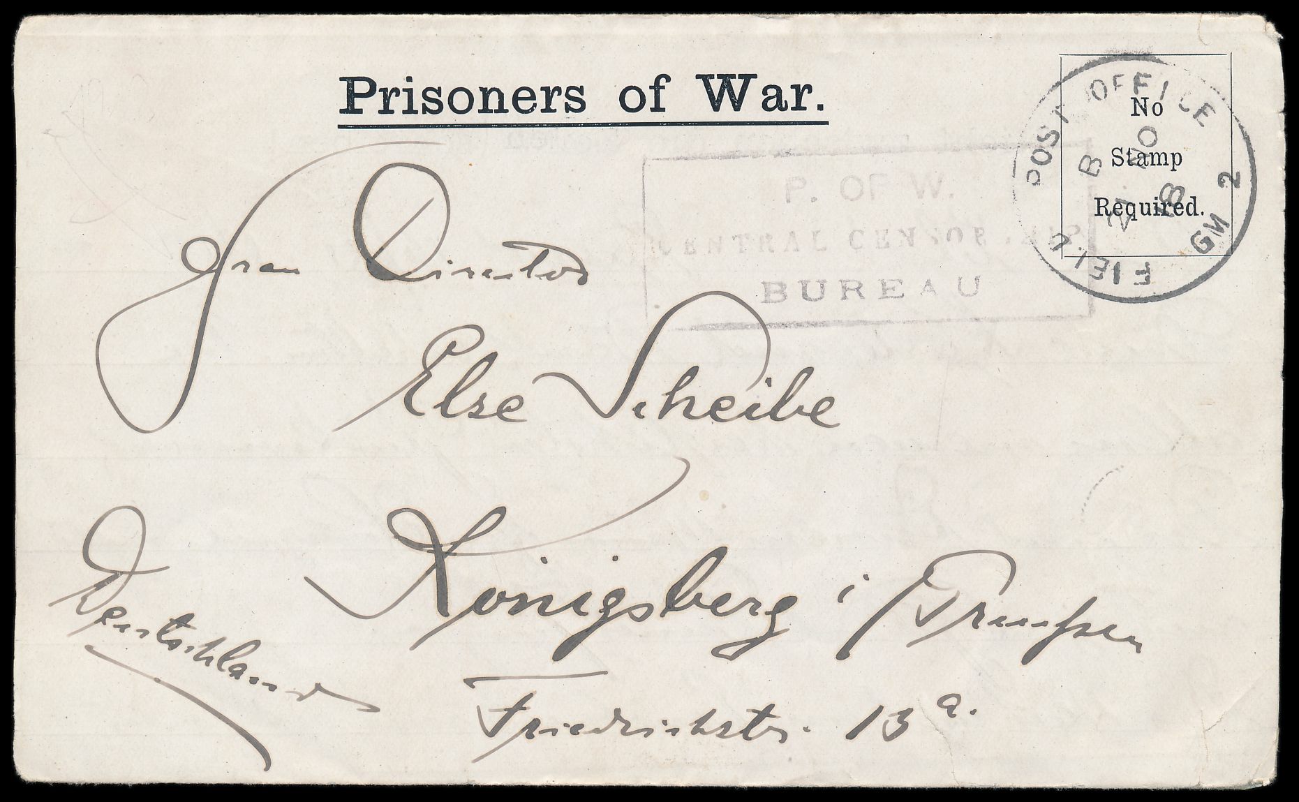 Vordruck-Faltbrief aus dem ägyptischen Kriegsgefangenenlager Tura nach Königsberg, R3 P. of. W. / Central Censorship / Bureau und Stempel Field Post Office GM 2 21.11.18, Absender Walter Schenk, interessanter Text: "... In unserer Kolonie war ich Leiter des Civilgefangenenlagers, meistens Frauen ..."