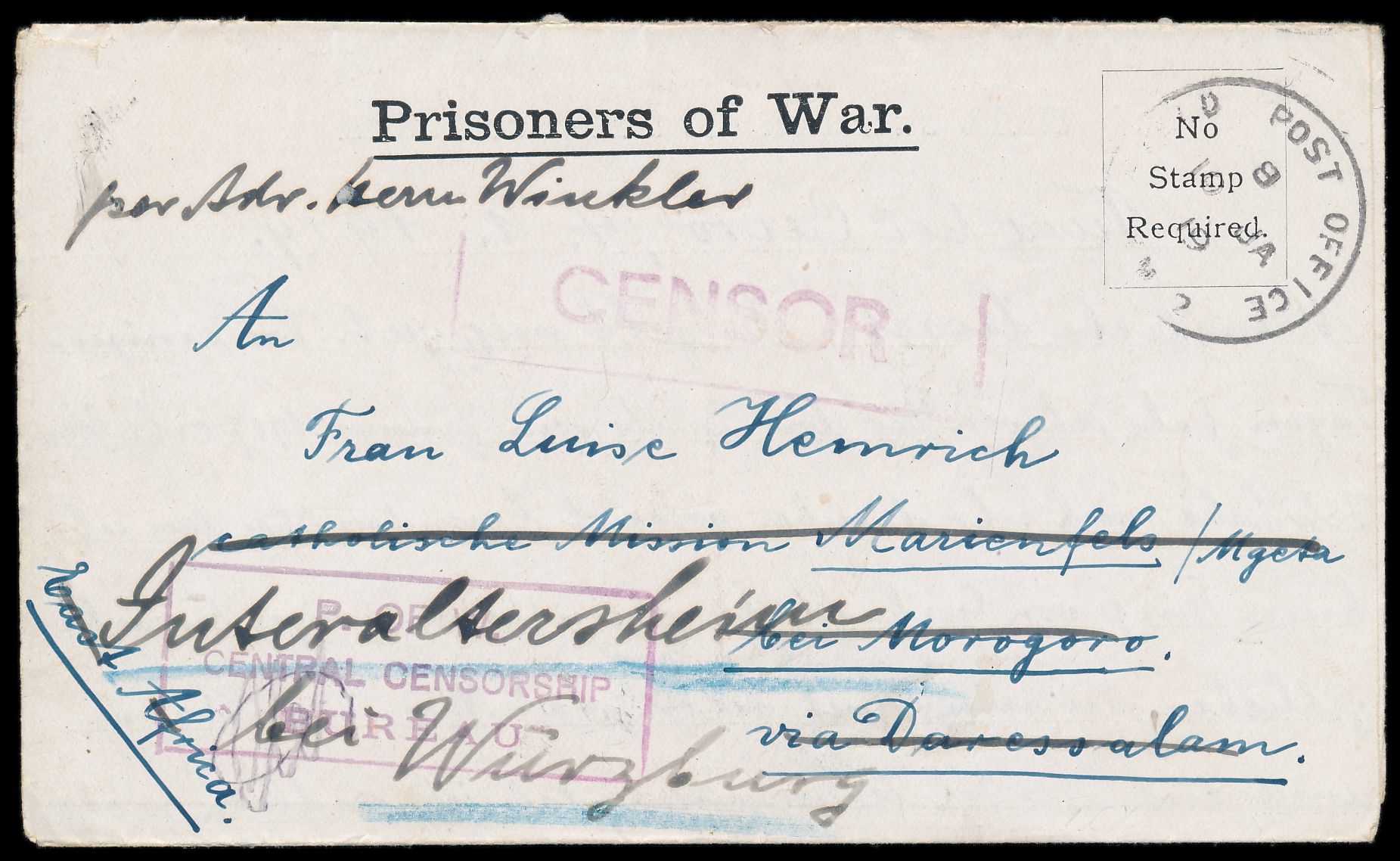 Kriegsgefangenenlager Tura bei Cairo: Vordruck-Faltbrief mit Absenderangabe Sergt. (Christian) Hemrich aus Deutsch-Ostafrika (vor dem Krieg Förster in Tanga), geschrieben am 4.1.1919, an seine Frau in Morogoro, violetter R3 P. of W. / Central Censorship / Bureau und Stempel Field Post Office GM2 10.1.19, nachgesandt nach Deutschland, violetter R1 Censor, rückseitig fehlt ein Teil der Briefklappe, Text mit DOA-Bezug