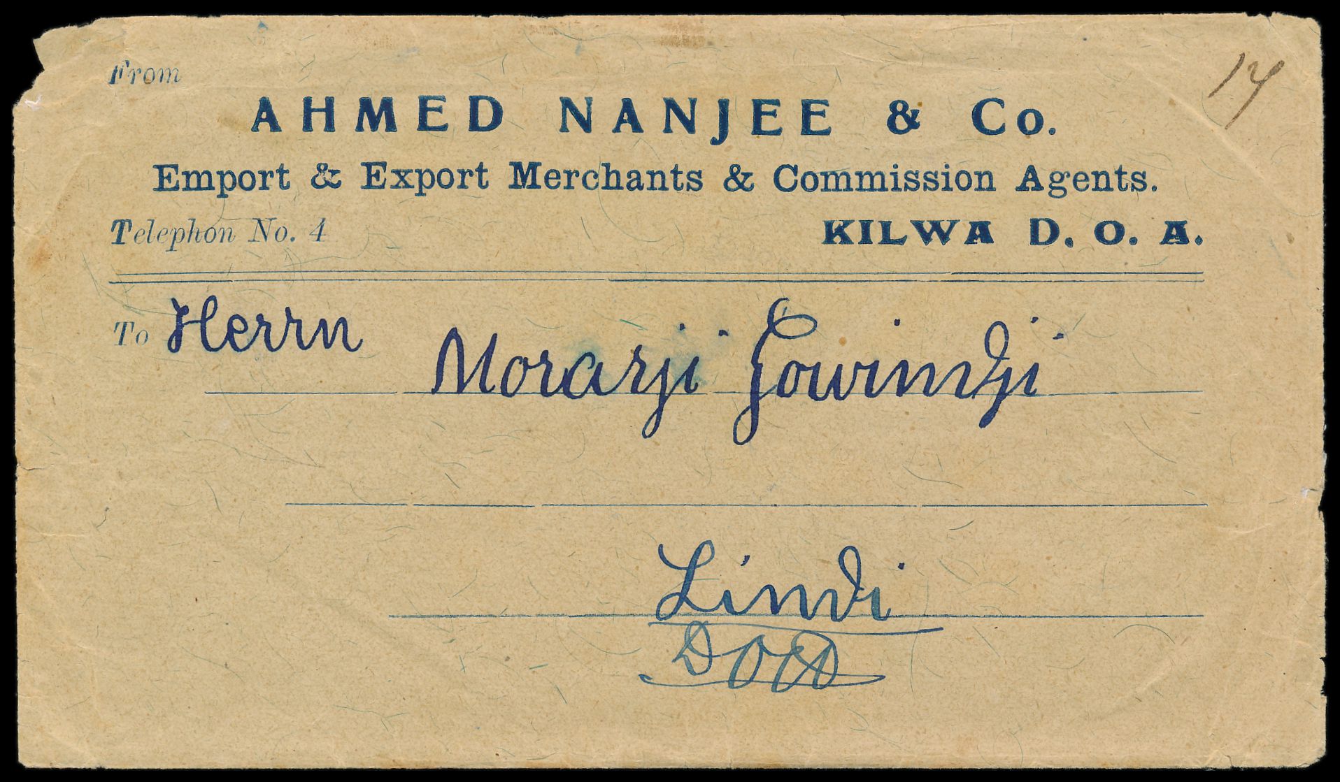 unfrankierter Dhaubrief aus indischer Korrespondenz von Kilwa nach Lindi, blaues Dienstsiegel der Zollverwaltung von Deutsch-Ostafrika Nr. 11 (verwendet in Kilwa), mit Inhalt in Gujerati, ca. 1914 / 1915