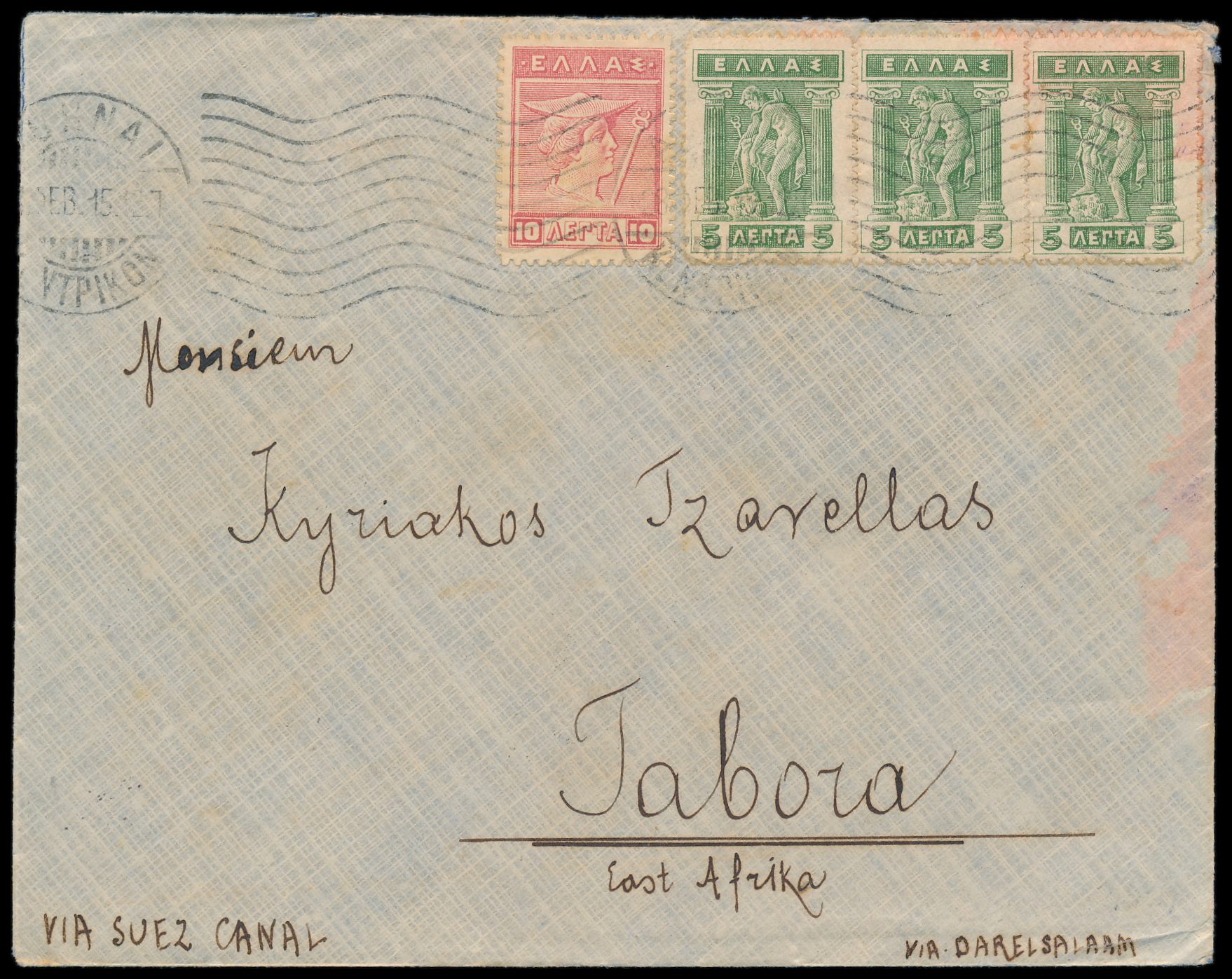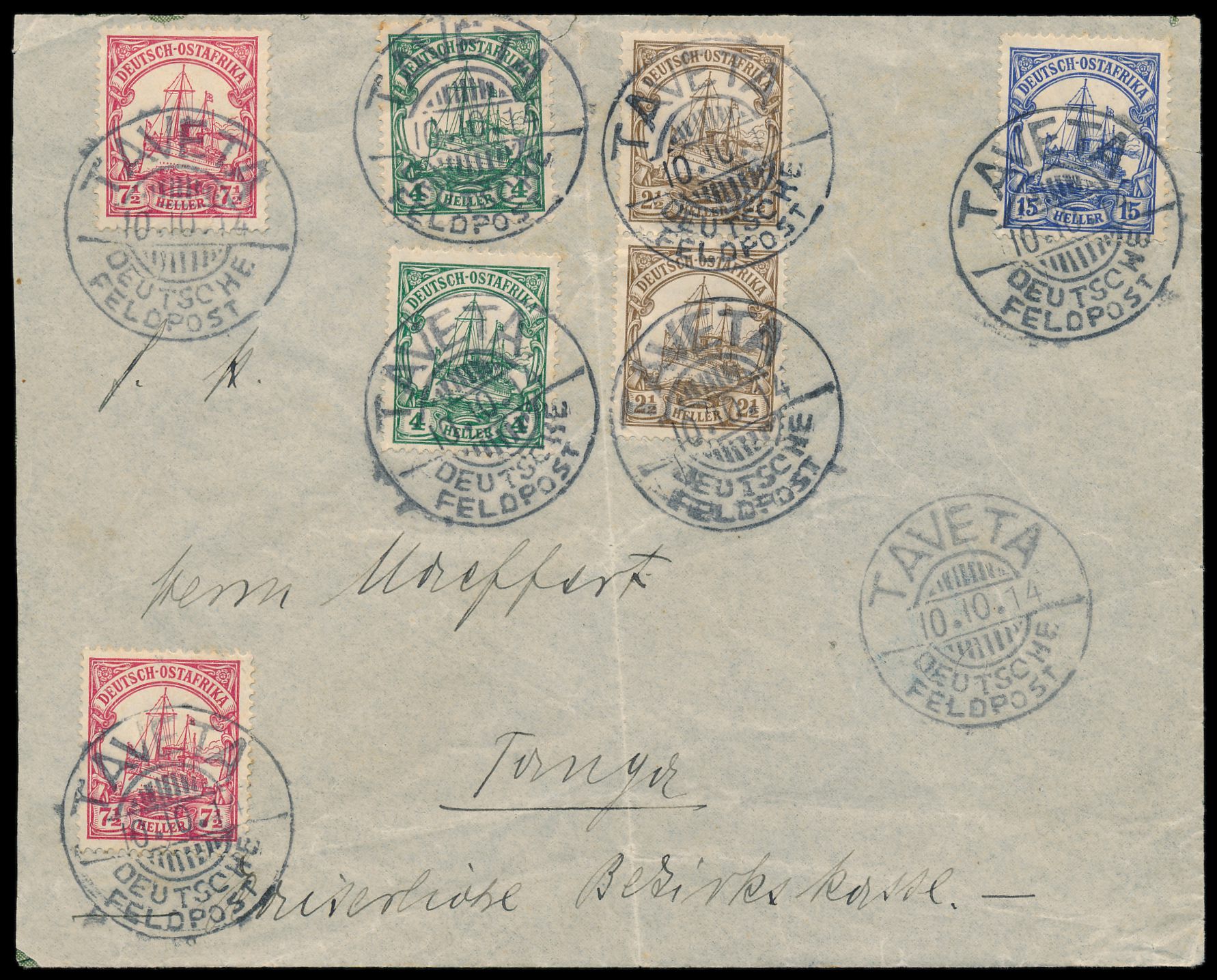 Stempel Taveta / Deutsche Feldpost 10.10.14 auf Sammler-Brief mit 2 x 2 1/2 H., 2 x 4 H., 2 x 7 1/2 H. und 1 x 15 H., jeweils einzeln gestempelt, nach Tanga, Ankunftstempel 15.10.14, senkrechter Mittelbug außerhalb der Frankatur