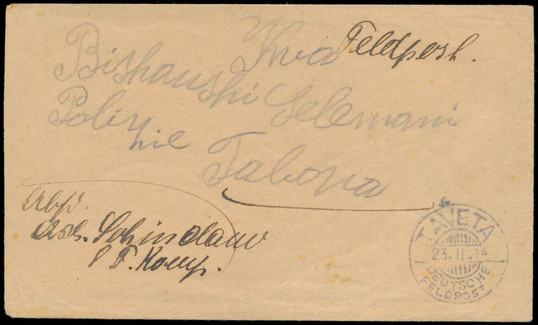 Stempel Taveta / Deutsche Feldpost 23.11.14 auf Feldpostbrief eines Askari in der 8. Feld-Kompagnie nach Tabora, Absenderangabe durch einen deutschen Vorgesetzten mit Tinte ergänzt , Ankunftstempel Tabora8.12.14, Bedarf