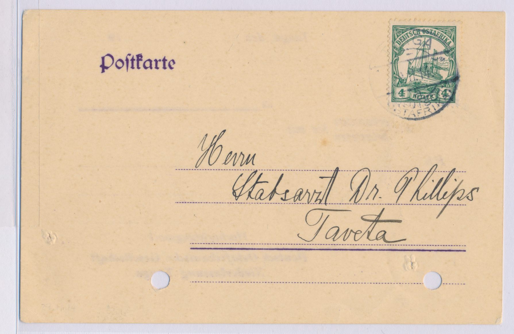 4 H. auf Postkarte mit Stempel Tanga a 29.11.14 an Stabsarzt Dr. Philips in Taveta, keine Portobefreiung für Geschäftskorrespondenz, unten Aktenlochung, Bedarf