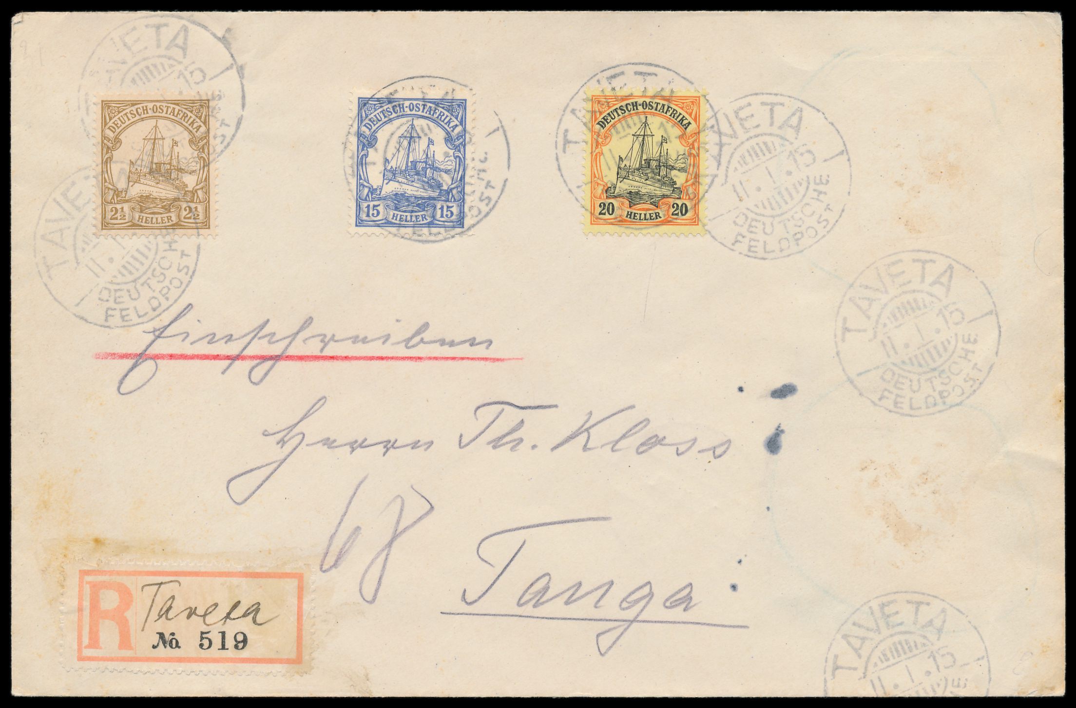 2 1/2, 15 und 20 H. (alle ohne Wasserzeichen!) auf Einschreibbrief mit Stempel Taveta / Deutsche Feldpost 11.1.15, 7 Abschläge, Aushilfs-R-Zettel, nach Tanga, Ankunftstempel 14.1.15