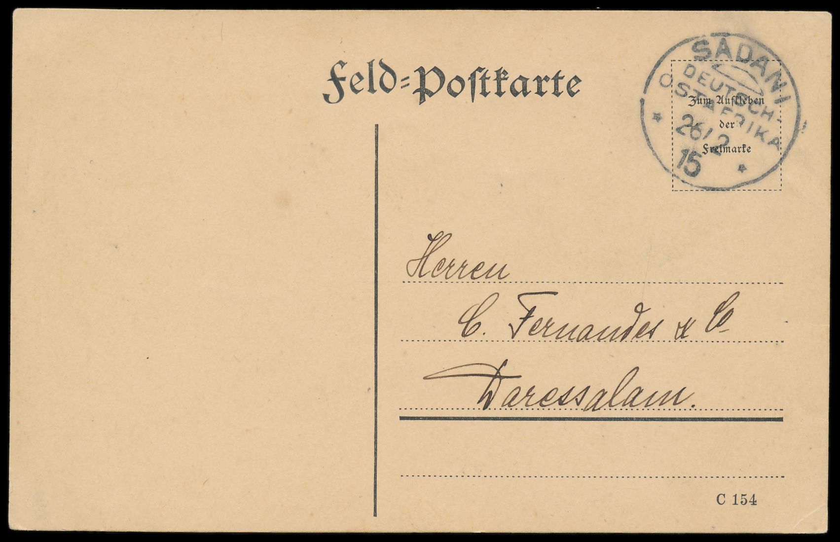 Stempel Sadani 26.2.15 mit Aushilfsjahreszahl auf C 154-Formular mit zugedrucktem "Feld-" vor Postkarte nach Daressalam, Stempel auf Feldpost selten, geschrieben "Posten Wami b. Sadani", Absender ist Vizefeldwebel Friedrich Eickenrodt, Bedarf