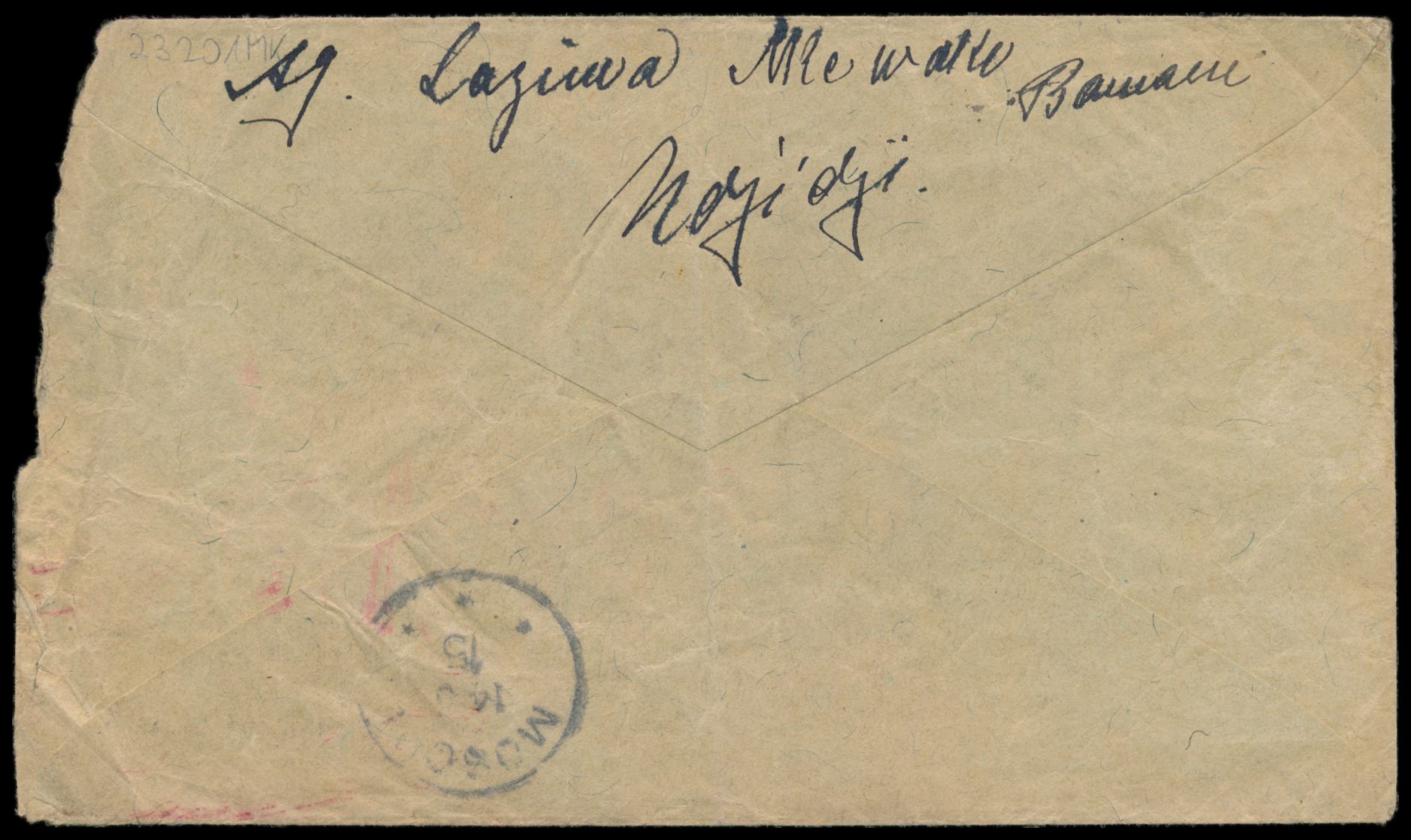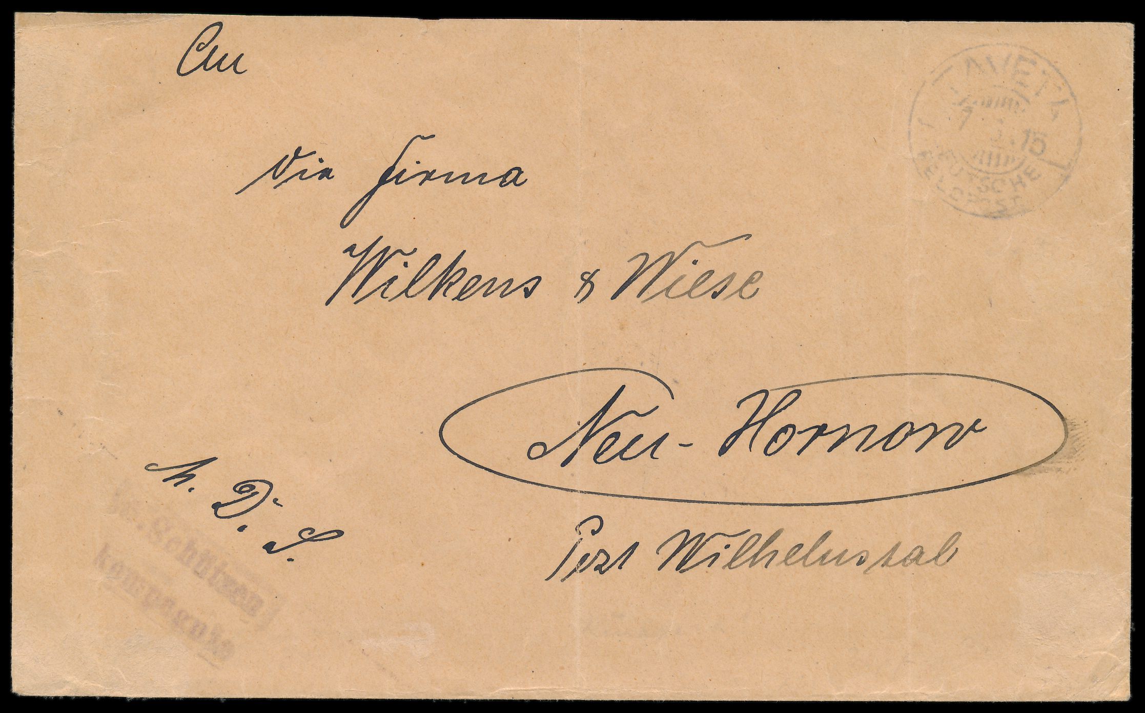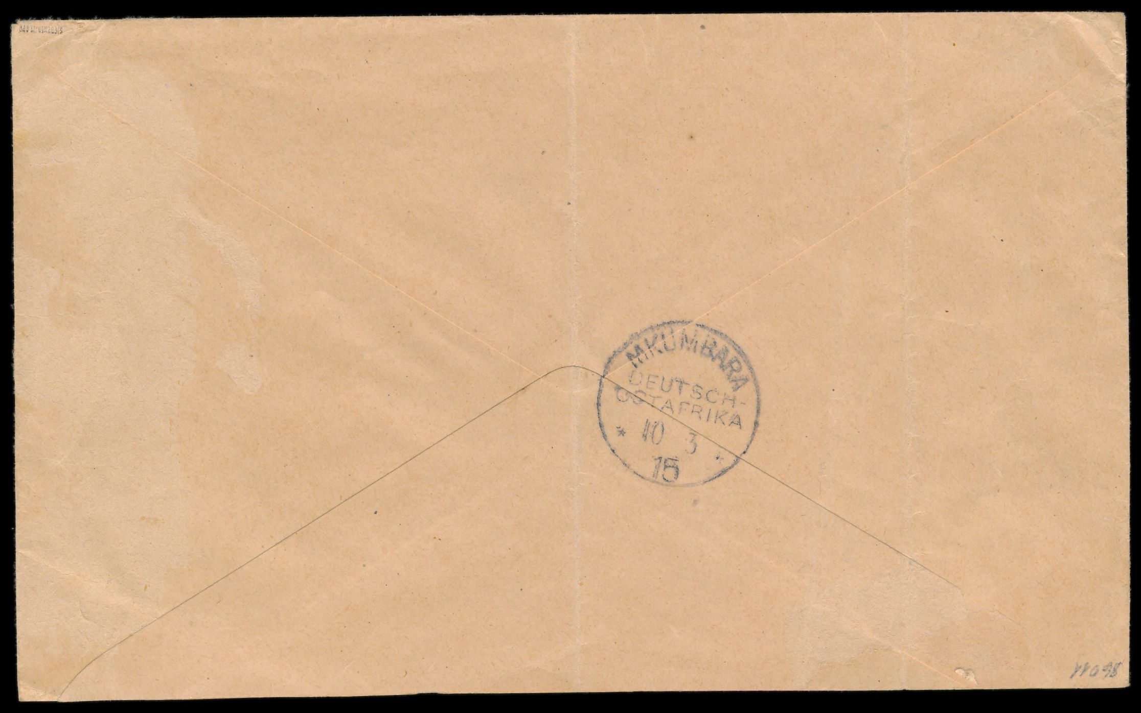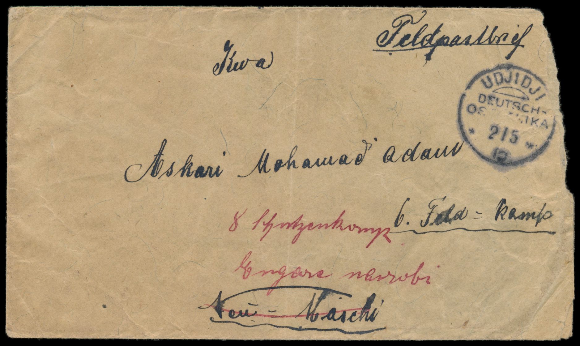 Stempel Udjidji 2.5.15 auf Feldpostbrief an einen Askari der 6. Feld-Kompanie in Neu-Moschi, Ankunftstempel Moschi 14.6.15, weitergeleitet an die 8. Schützenkompanie in Engare-Nairobi, Umschlag hat rechts Öffnungsmängel, Bedarf