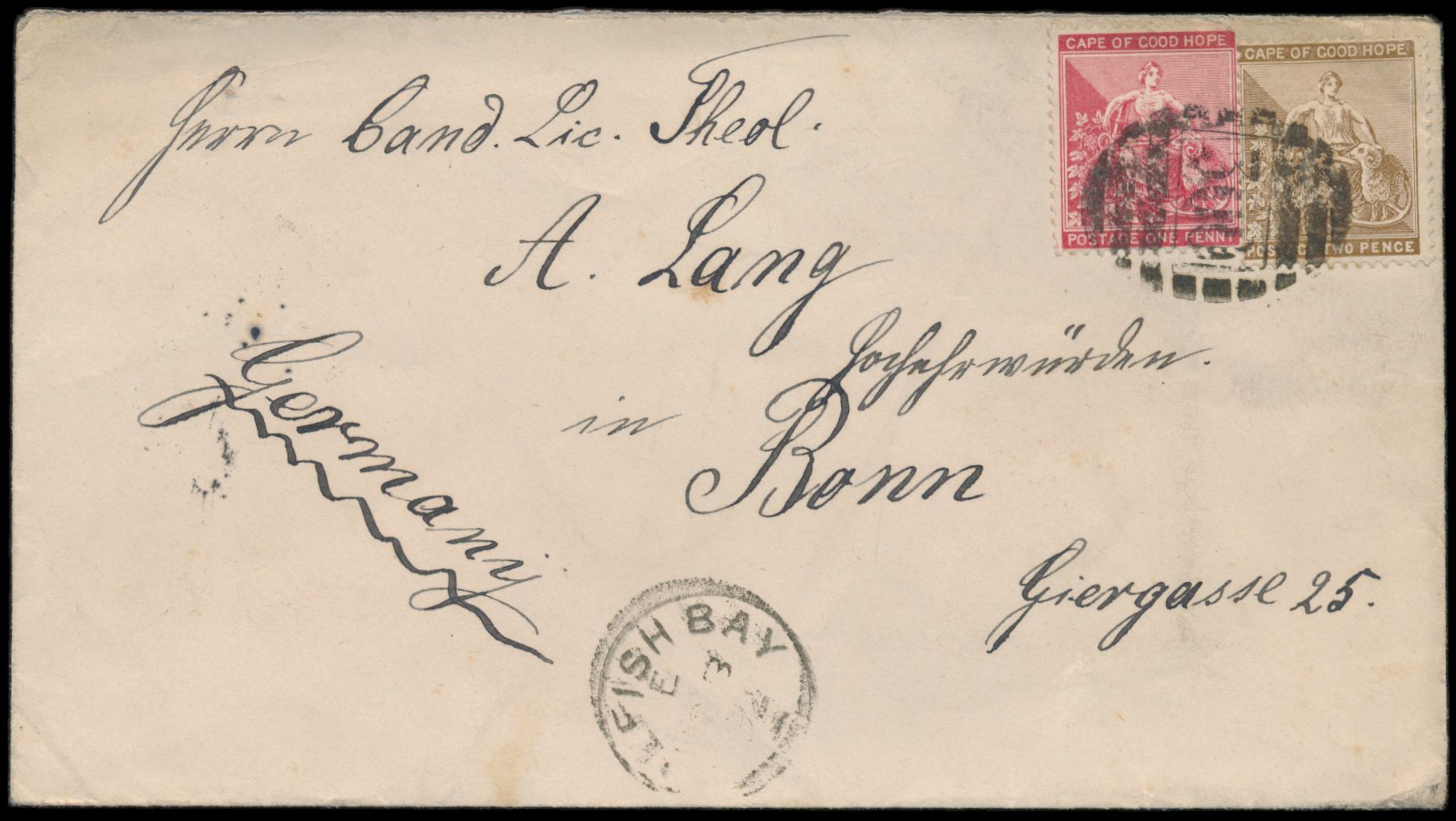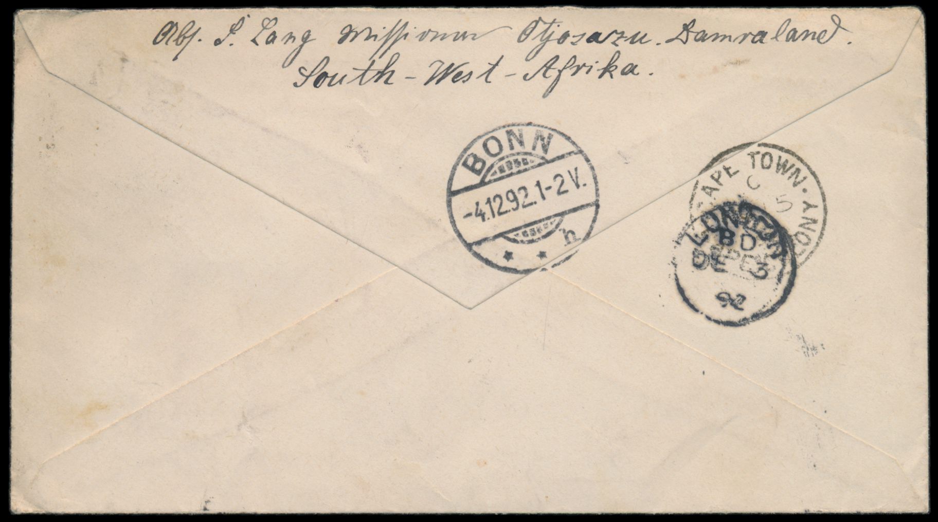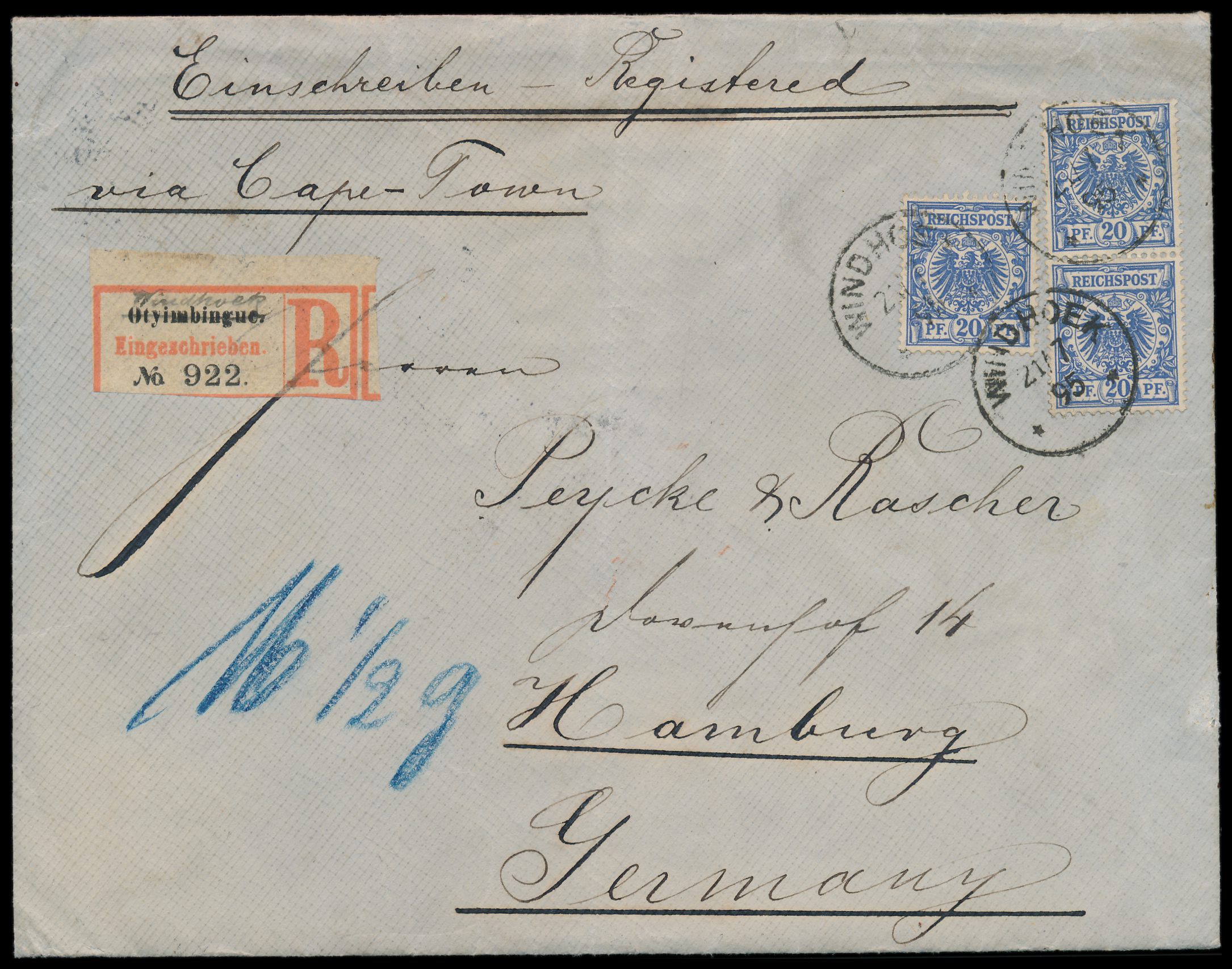 3 x Vorläufer 20 Pf. auf Einschreibbrief 2. Gewicht mit Stempel Windhoek 21.7.95 "via Cape Town" nach Hamburg, R-Zettel Otyimbingue handschriftlich geändert in "Windhoek", Einfeldt Nr. 1 II, rückseitig Absenderstempel Wecke & Voigts, Windhoek, Durchgangstempel Registered Letter Office Capetown 1.8.95, Ankunftstempel Hamburg 3.9.95, Bedarf