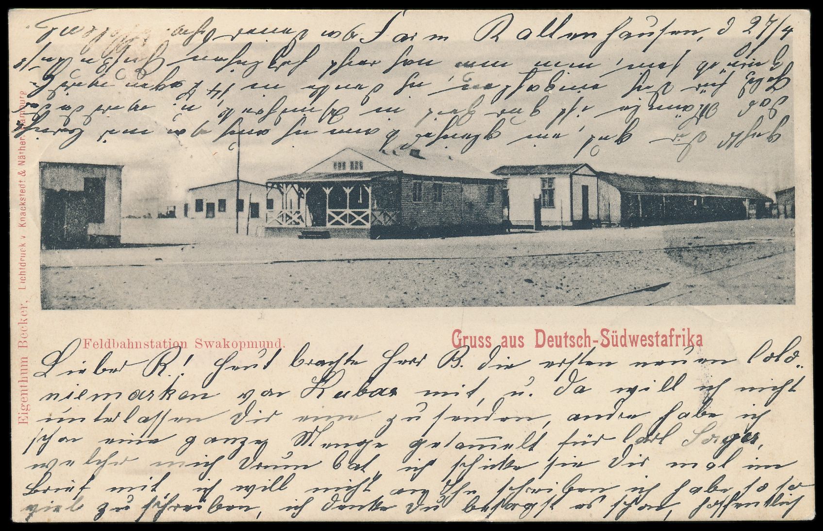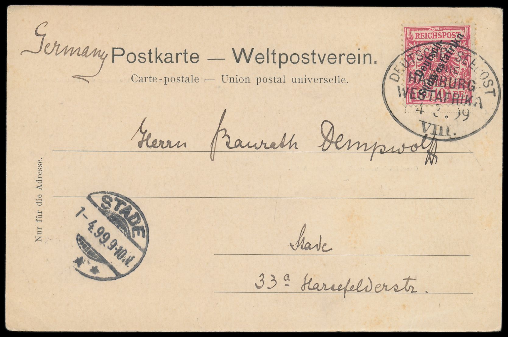 Stempel Deutsche Seepost Linie Hamburg - Westafrika VIII. 4.3.99, Dampfer Melita Bohlen, Dreibild-Ansichtskarte Swakopmund, Frankatur DSWA 10 Pf., auf DSWA selten, nach Stade, Ankunftstempel 1.4.99, Bedarf