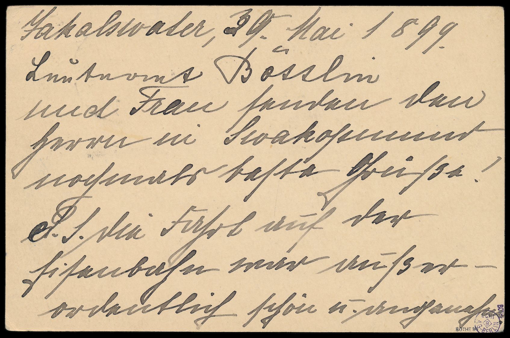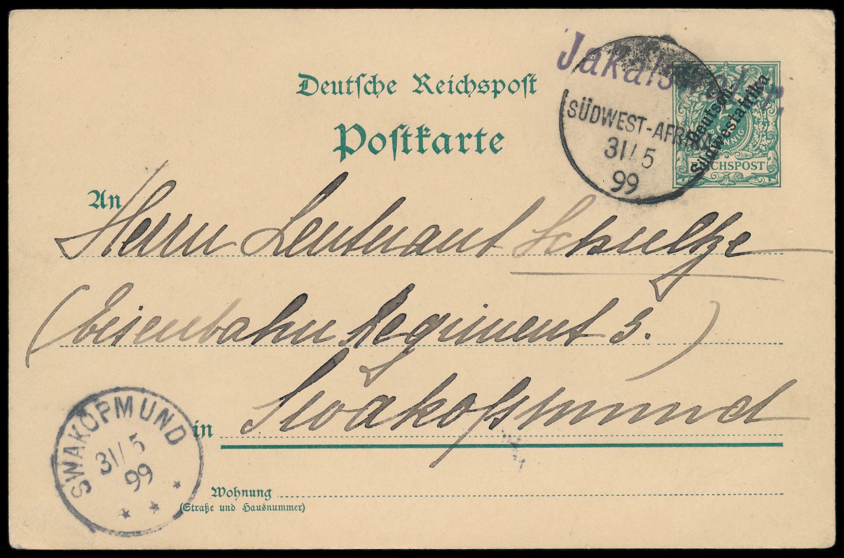 violetter L1 Jakalswater und Wanderstempel 31.5.99 auf Ganzsache 5 Pf. nach Swakopmund, Ankunftstempel 31.5.99, Absender ist Leutnant Bösslin, Bedarf, signiert Bothe BPP
