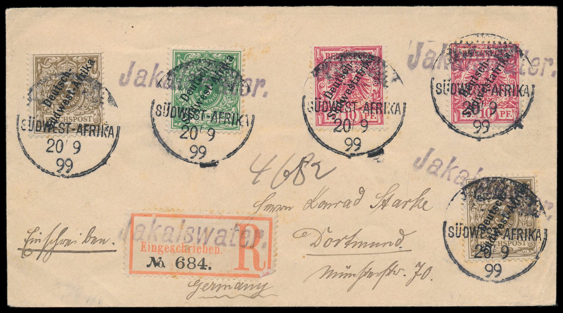 3 x violetter L1 Jakalswater und 5 x Wanderstempel 20.9.99 auf Einschreibbrief mit 2 x 3 Pf., 5 Pf. und 2 x 10 Pf. nach Dortmund, gleicher L1 Jakalswater auch auf Blanko-R-Zettel, Einfeldt Nr. 1 II., Ankunftstempel 22.10.99