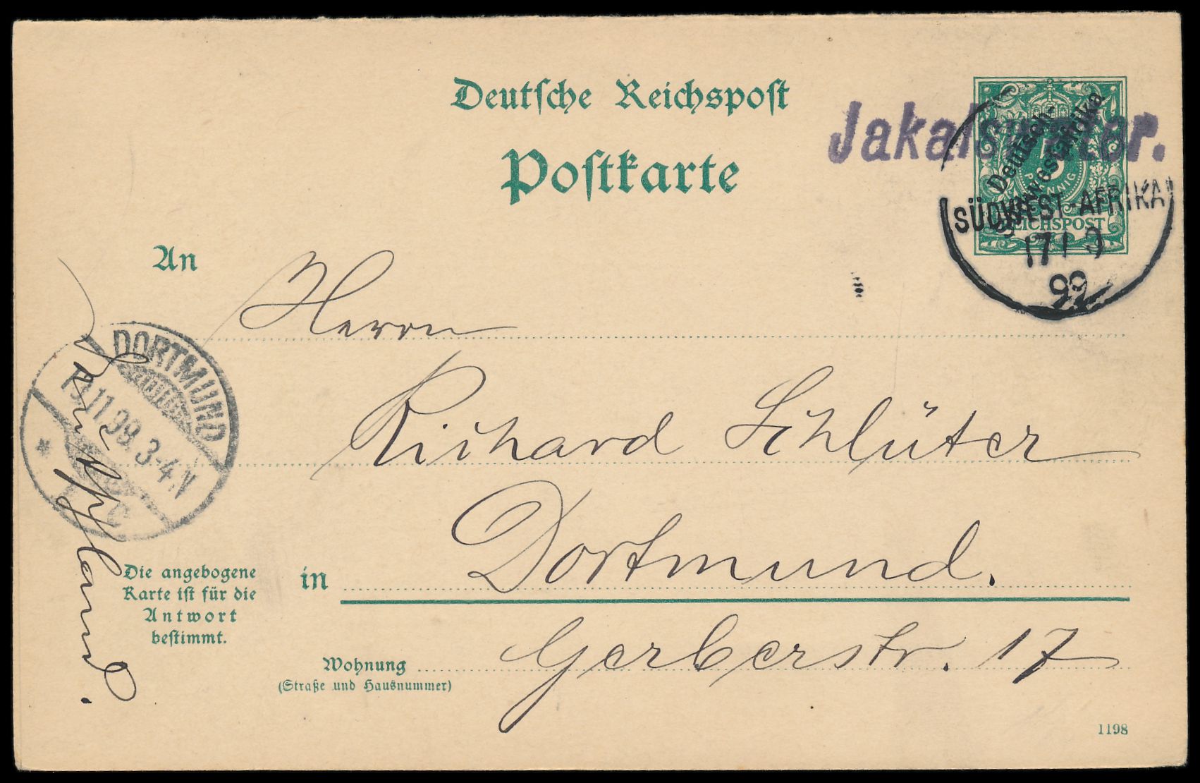violetter L1 Jakalswater und Wanderstempel 17.10.99 auf Ganzsachen-Doppelkarte 5 Pf. nach Dortmund, Ankunftstempel 18.11.99, ohne Text, A-Teil hängt ungebraucht an