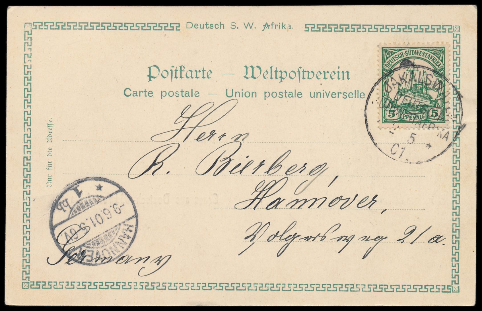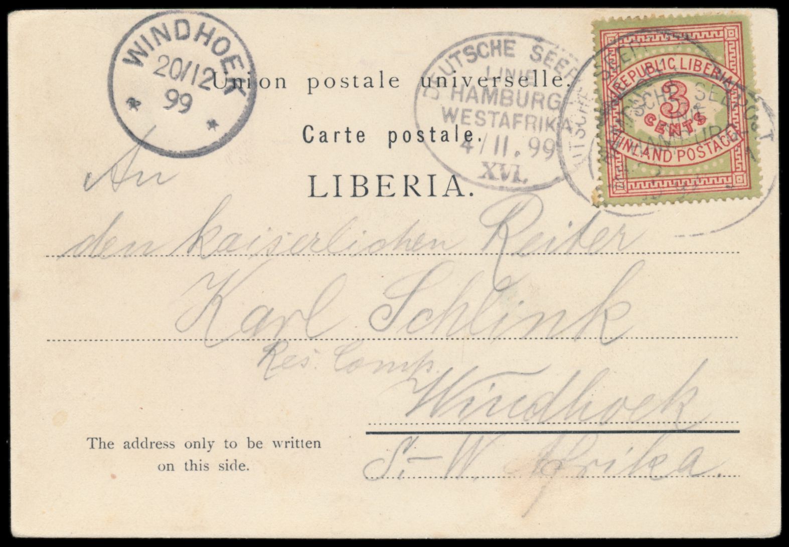 Ansichtskarte mit Liberia 3 C. und Stempel Deutsche Seepost Linie Hamburg - Westafrika XVI. 4.11.99, Dampfer Thekla Bohlen, laut Czimmek-Handbuch auf Auslandsfrankaturen nicht belegt, nach Windhoek, Ankunftstempel 20.12.99, Bedarf