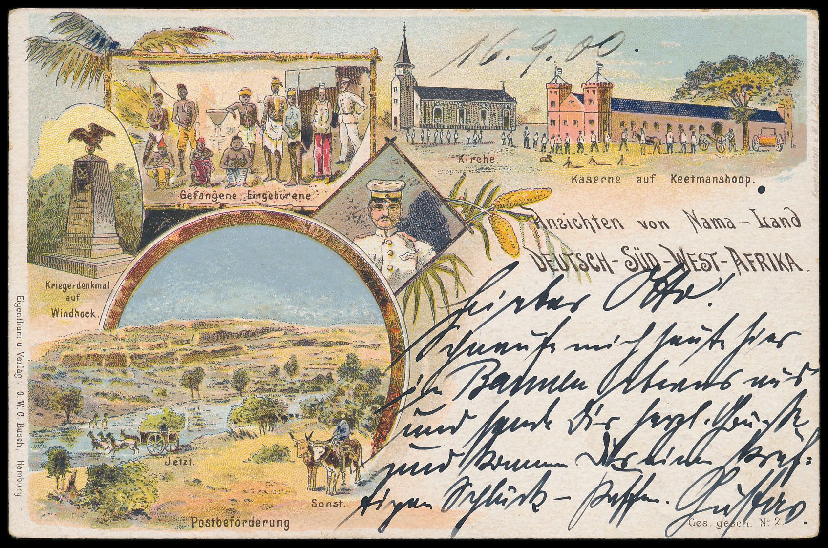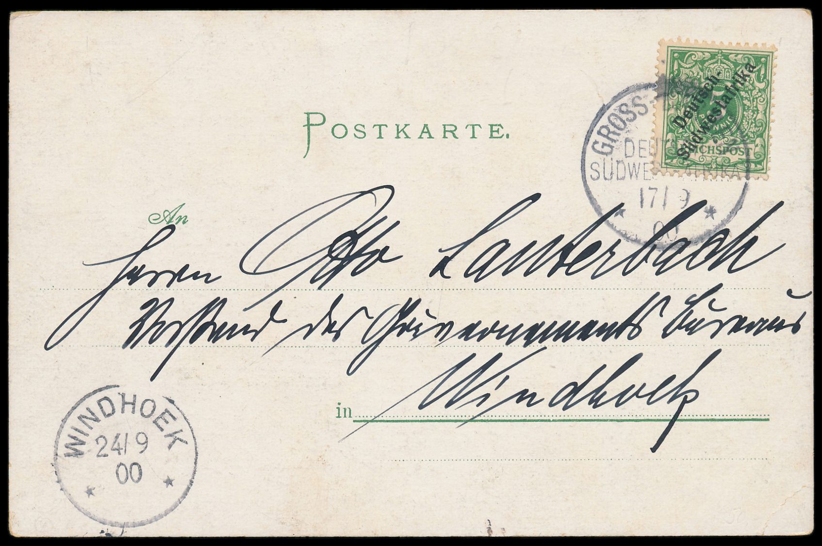 Litho-Ansichtskarte "Ansichten von Nama-Land ...", Frankatur 5 Pf., Stempel Gross-Barmen 17.9.00, nach Windhoek, Ankunftstempel 24.9.00, Bedarf