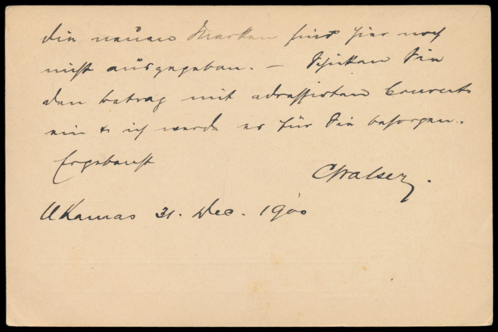 Stempel Ukamas 1.1.01 auf Jahrhundertfeier-Ganzsache 5 Pf. Germania nach Deutschland, Ankunft Erlau (Sachsen) 4.2.01, rückseitig mit Text