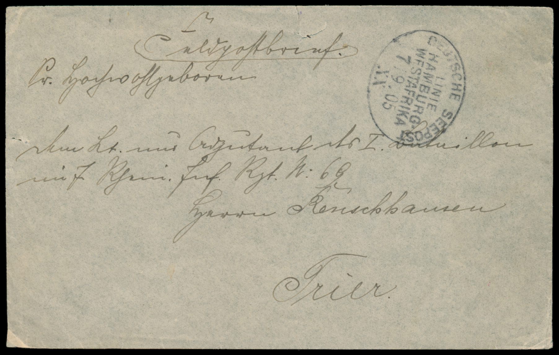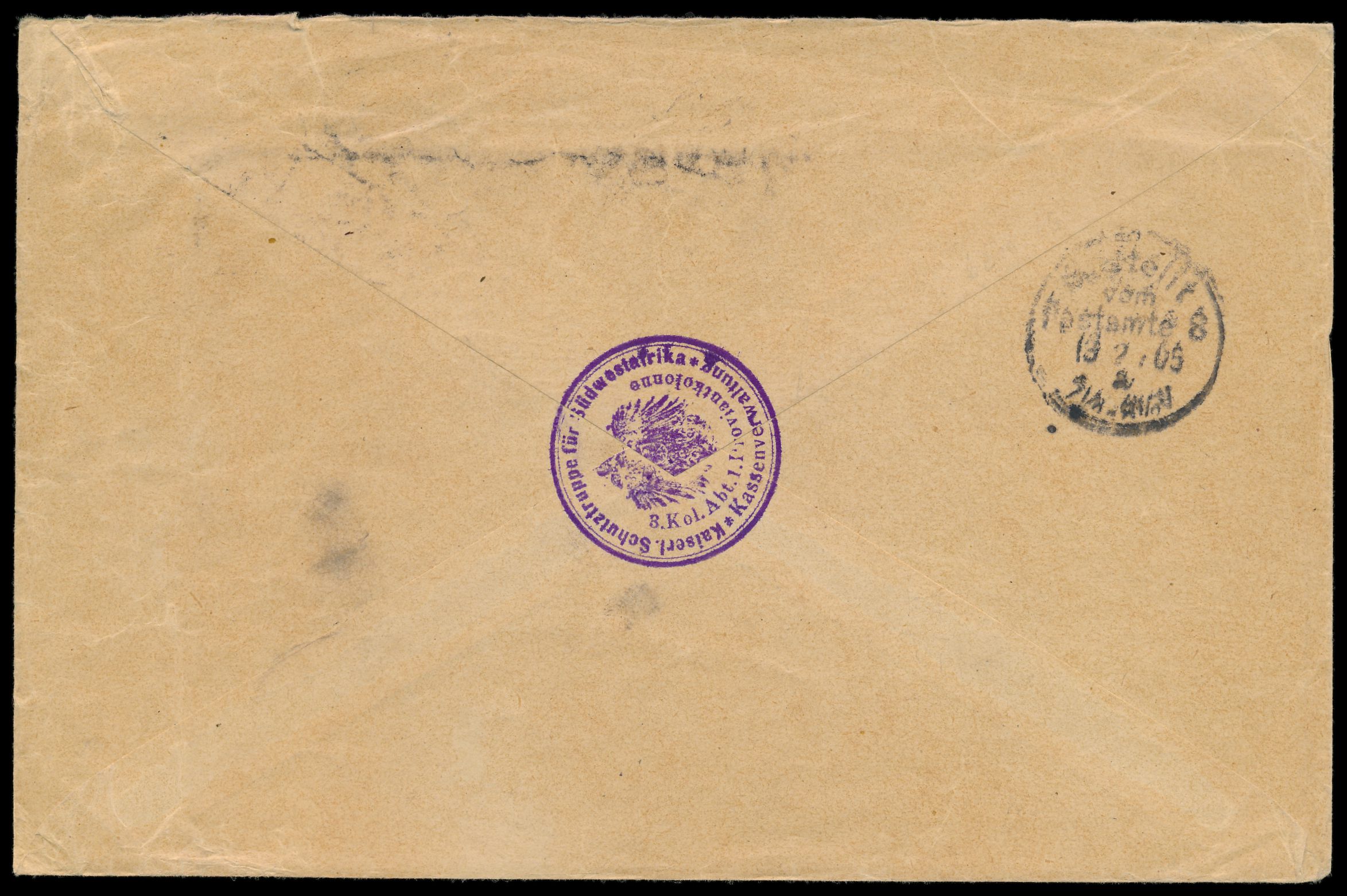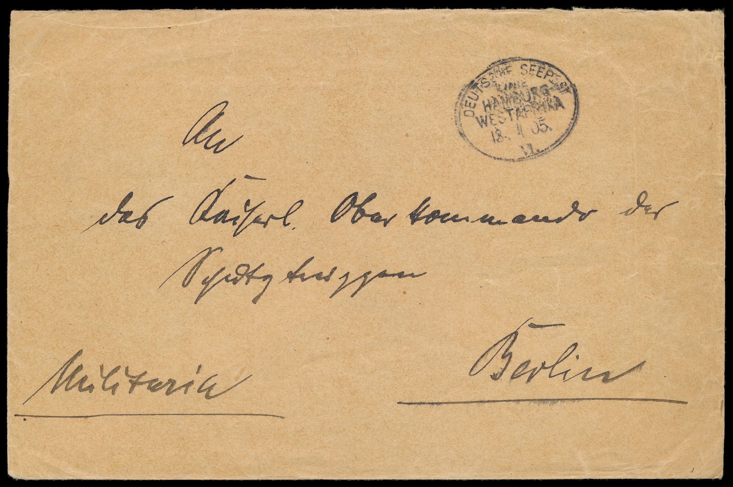 Stempel Deutsche Seepost Linie Hamburg - Westafrika VI. 13.1.05, Dampfer Prinzregent, etwas verwackelter Abschlag auf Militaria-Dienstbrief an das Oberkommando der Schutztruppen in Berlin, rückseitig seltenes Dienstsiegel (Adlerstempel) ... 3. Kol. Abt. 1. Proviantkolonne / Kassenverwaltung, im Vogenbeck-Katalog nicht aufgeführt, Ankunftstempel 13.2.05