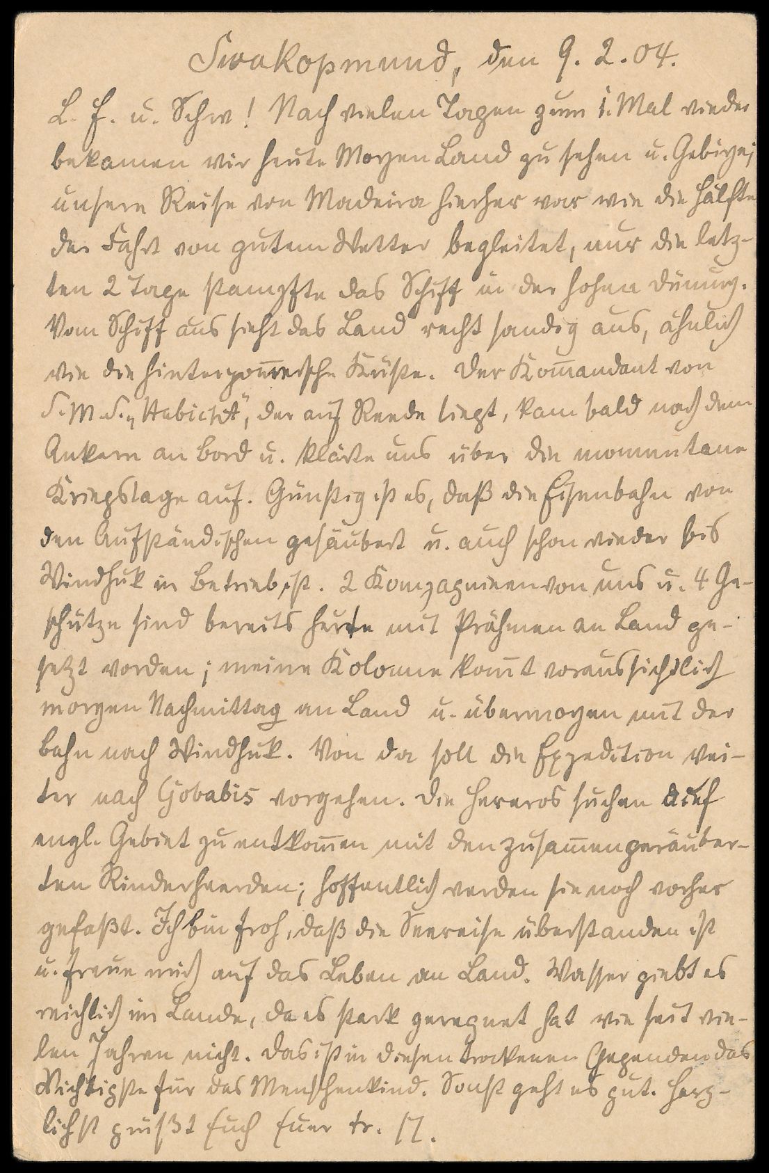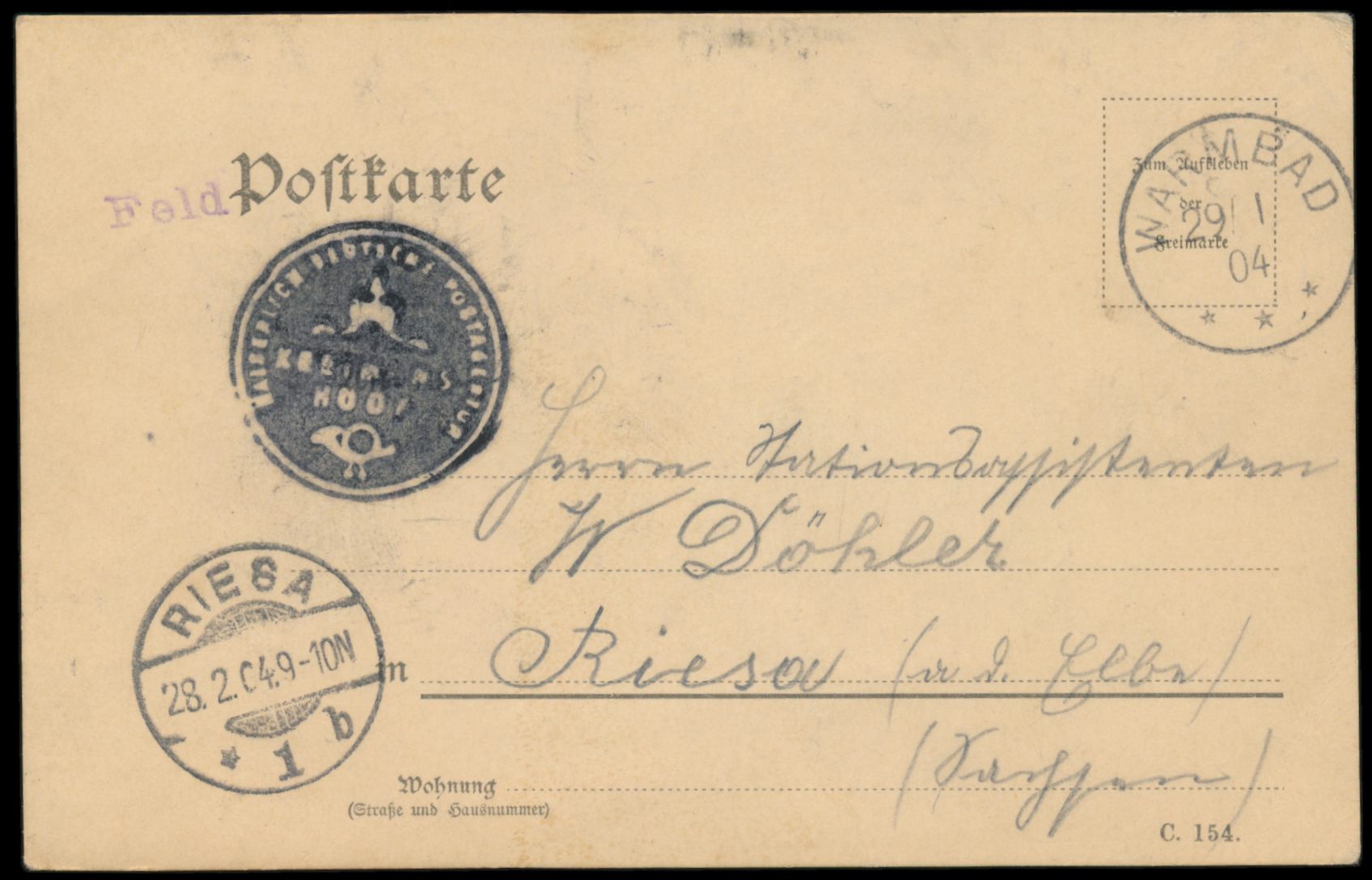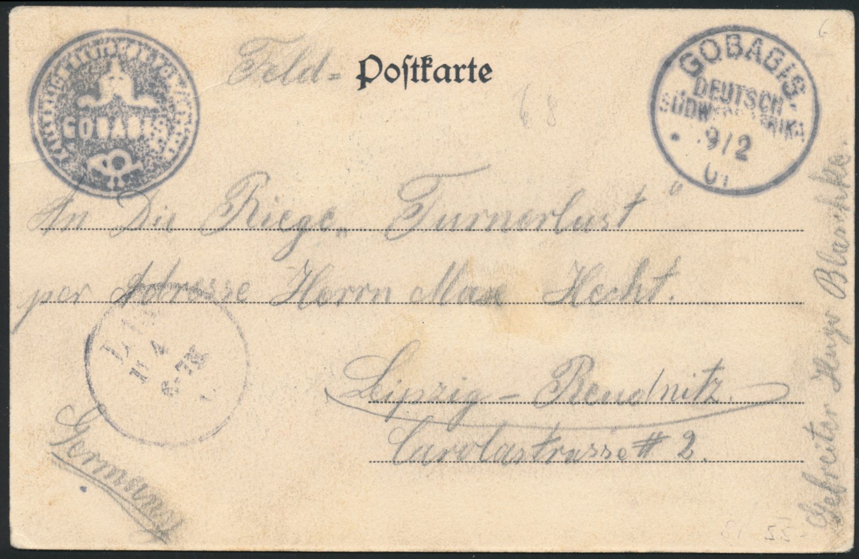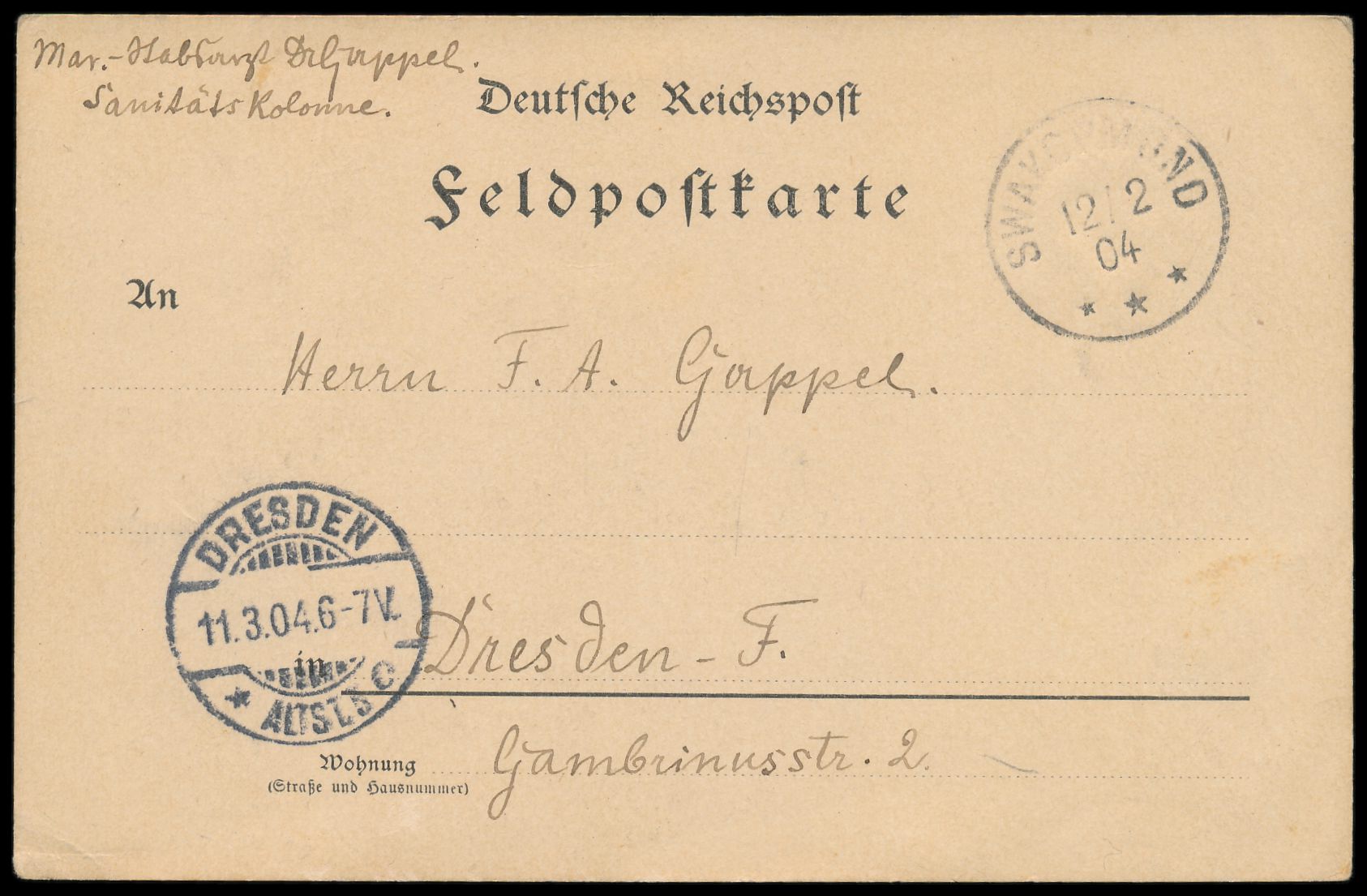 Stempel Swakopmund 12.2.04 auf Feldpost-Vordruckkarte nach Dresden, geschrieben bereits am 9.2.1904, bisher früheste bekannte Verwendung einer Feldpost-Vordruckkarte in DSWA, handschriftlicher Absender "Marine-Stabsarzt Dr. Gappel, Sanitäts-Kolonne.", nach Dresden, Ankunftstempel 11.3.04, rückseitig viel Text mit ausführlicher Beschreibung der Kriegslage, Absender gehört zum Marine-Expeditions-Korps, das vom 9. bis 12.2.1904 in Swakopmund vom N.D.L-Dampfer Darmstadt ausgeschifft wurde. Dieser Dampfer brachte auch die ersten Feldpost-Vordruckkarten nach DSWA