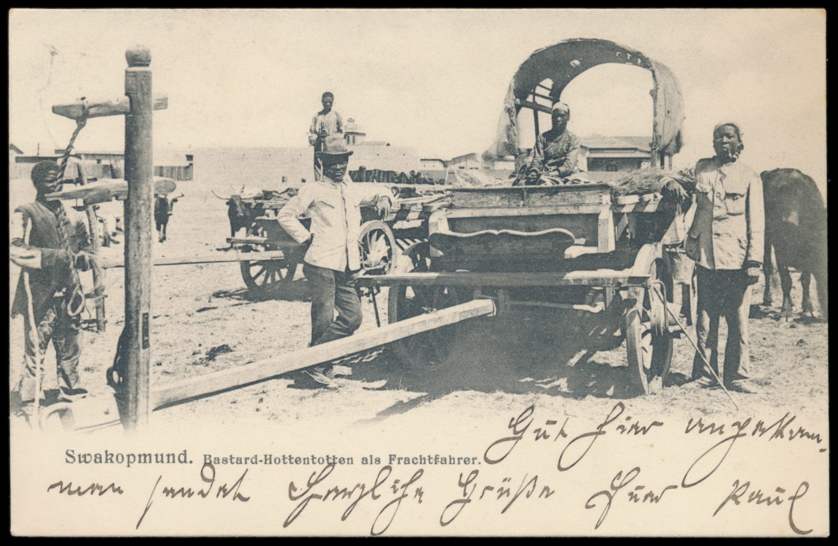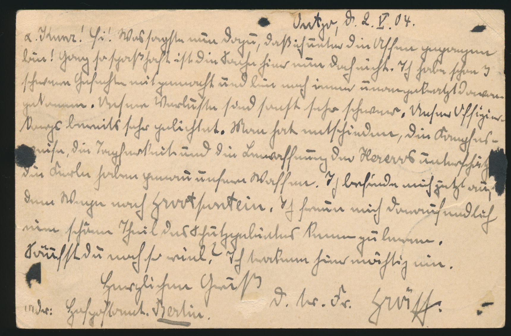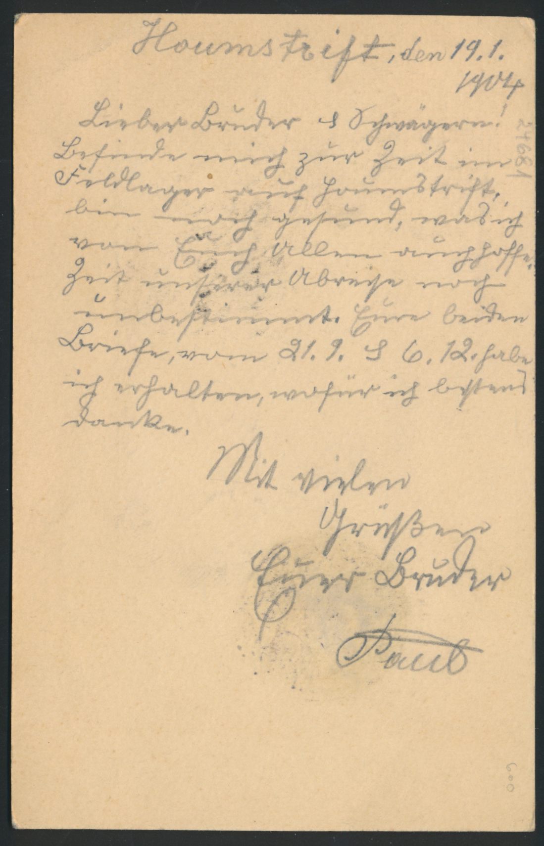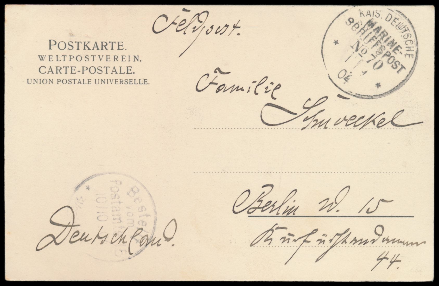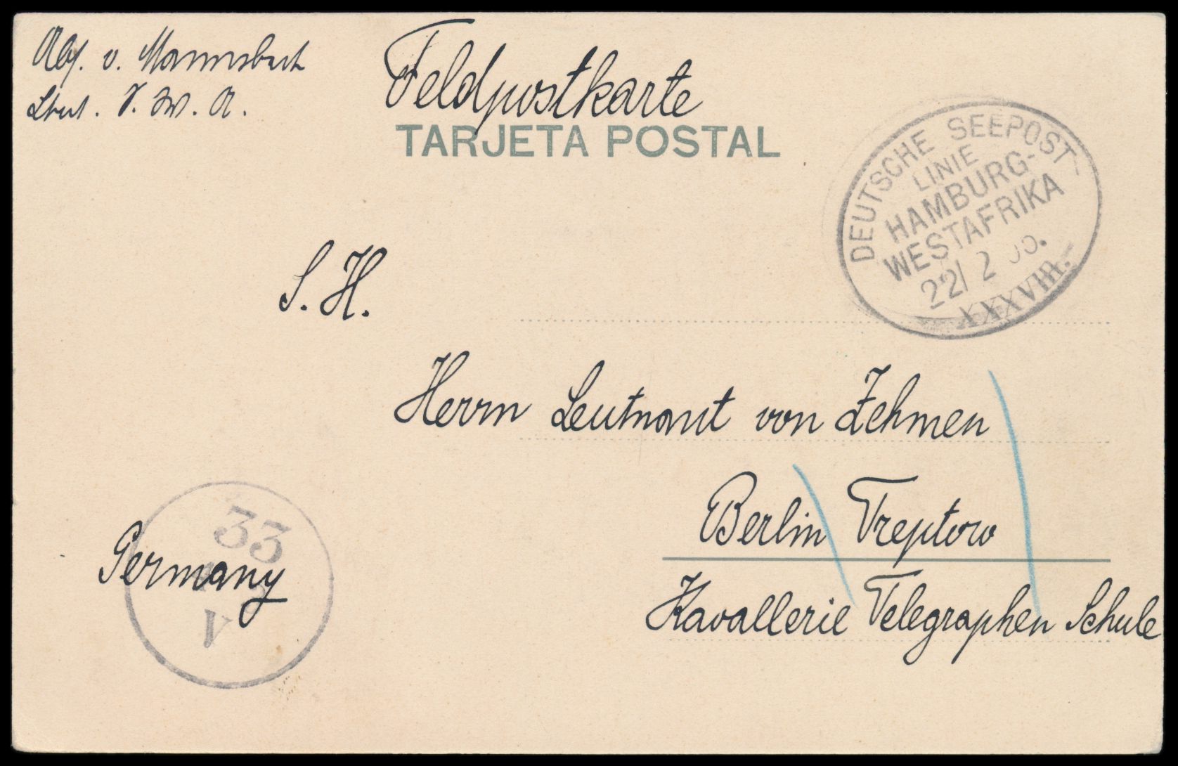 Stempel Swakopmund 12.2.04 auf Feldpost-Vordruckkarte nach Dresden, geschrieben bereits am 9.2.1904, bisher früheste bekannte Verwendung einer Feldpost-Vordruckkarte in DSWA, handschriftlicher Absender "Marine-Stabsarzt Dr. Gappel, Sanitäts-Kolonne.", nach Dresden, Ankunftstempel 11.3.04, rückseitig viel Text mit ausführlicher Beschreibung der Kriegslage, Absender gehört zum Marine-Expeditions-Korps, das vom 9. bis 12.2.1904 in Swakopmund vom N.D.L-Dampfer Darmstadt ausgeschifft wurde. Dieser Dampfer brachte auch die ersten Feldpost-Vordruckkarten nach DSWA
