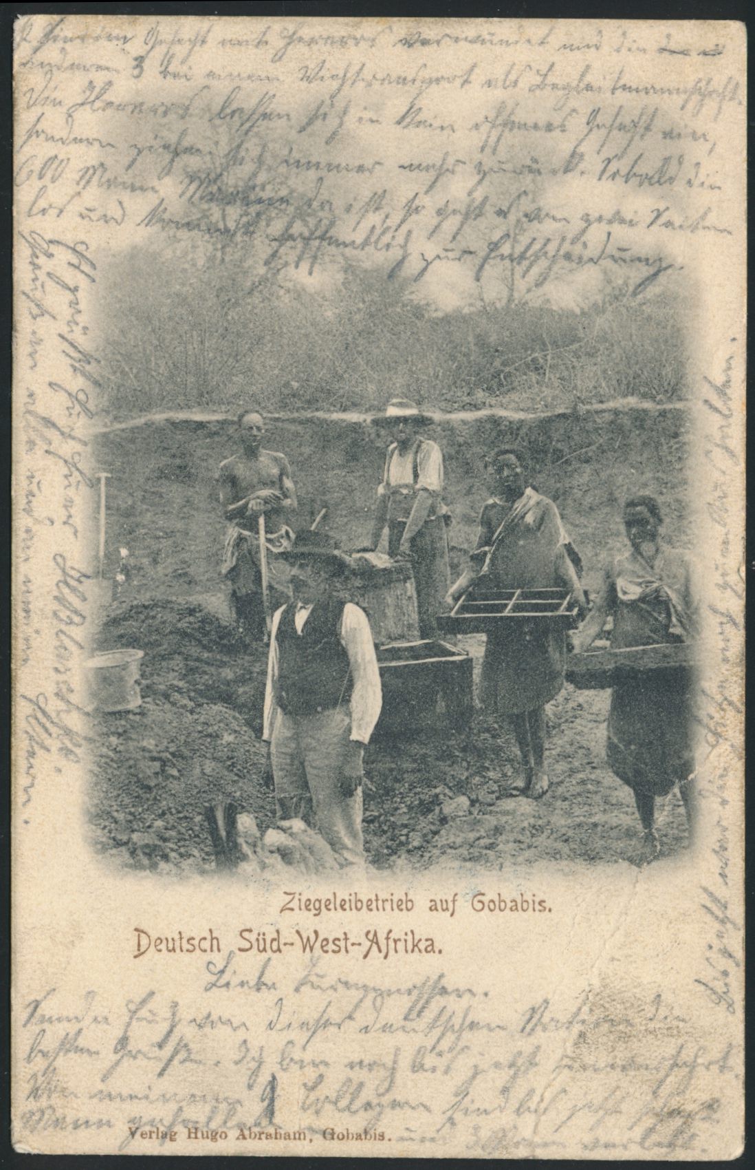 Stempel Gobabis 9.2.04 und Negativ-Dienstsiegel "Kaiserlich Deutsche Postagentur Gobabis" auf Ansichtskrte "Ziegeleibetrieb auf Gobabis" , Feldpost nach Leipzig, unauffälliger Eckbug, Bedarf