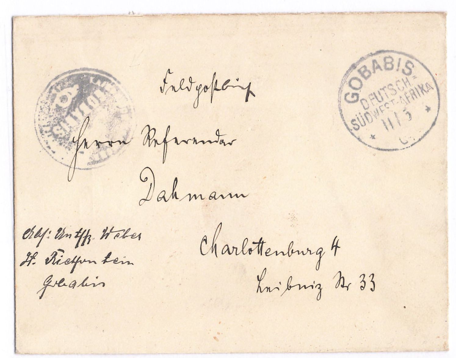 Feldpostbrief mit Stempel Gobabis 11.5.04 und Negativ-Dienstsiegel Kaiserlich Deutsche Postagentur Gobabis mit Krone und Posthorn, vorderseitig handschriftliche Absenderangabe ... Station Rietfontein ..., nach Charlottenburg, Ankunftstempel 24.6.05, Bedarf