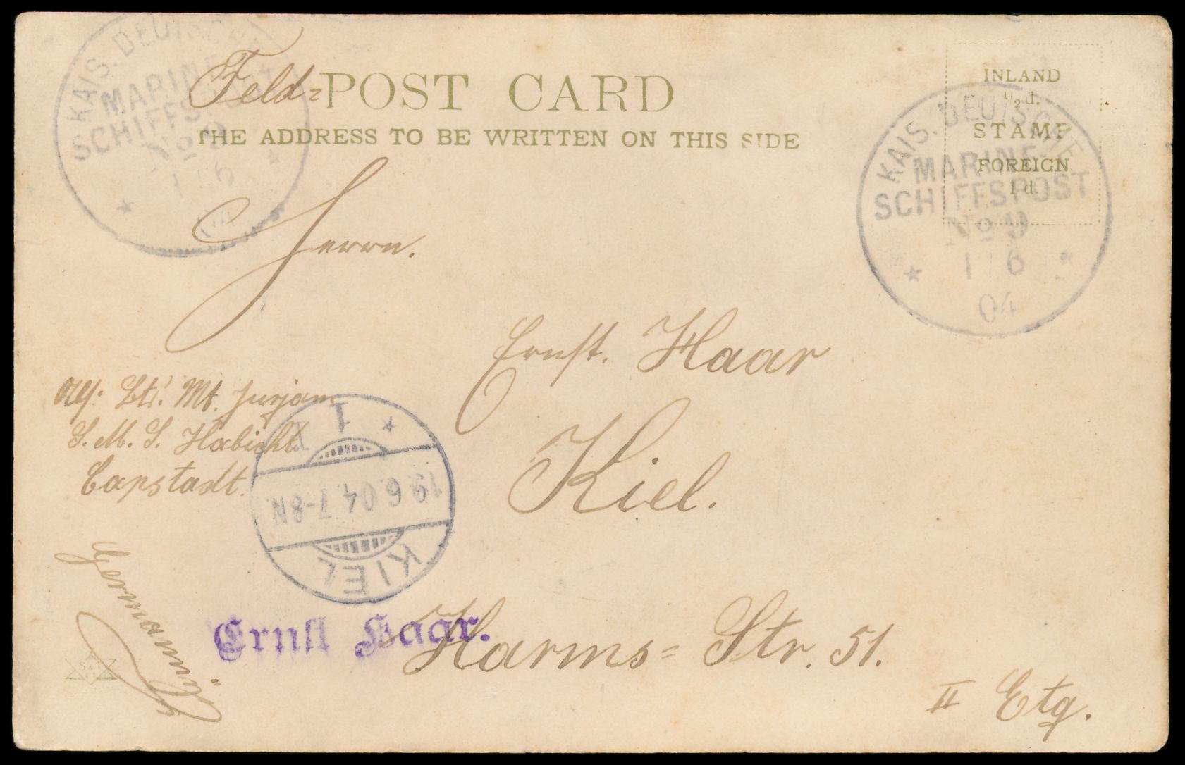 Stempel MSP No. 9 1.6.04, S.M.S. Habicht, zwei Abschläge auf Ansichtskarte Capstadt, Feldpost nach Kiel, Ankunftstempel 19.6.04, Bedarf