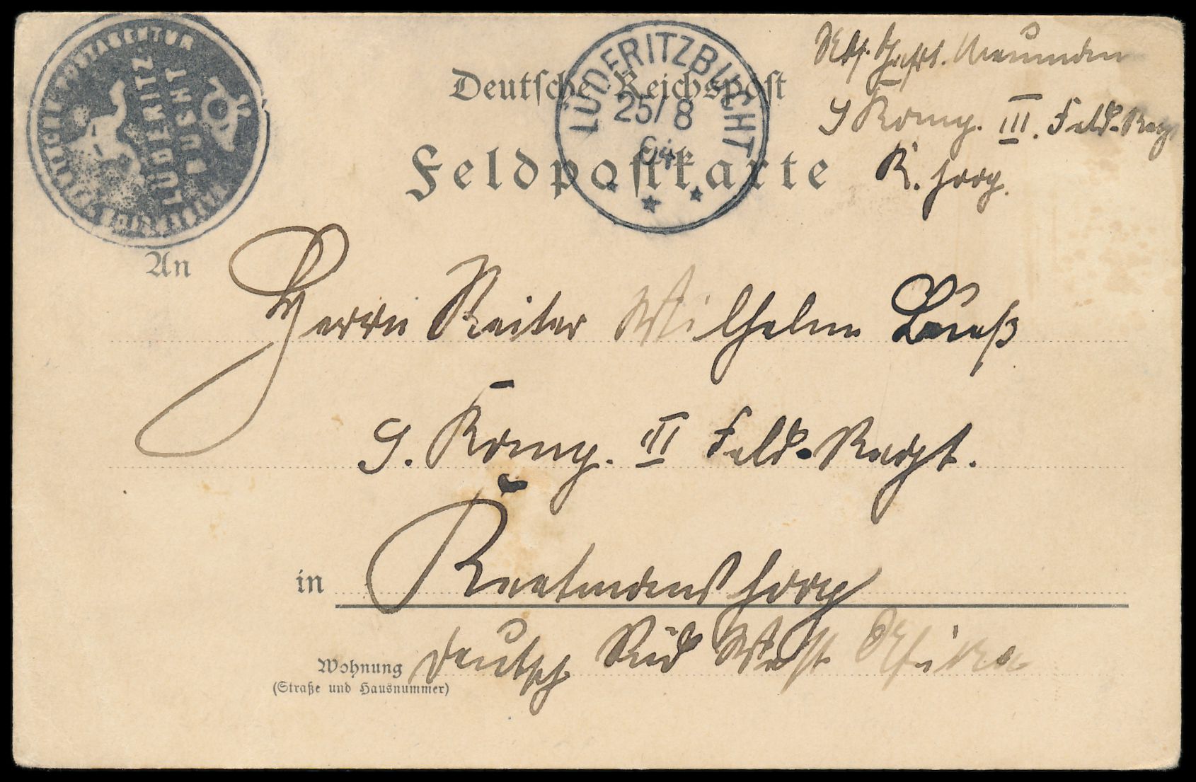 Stempel Lüderitzbucht 25.8.04 und Negativ-Dienstsiegel Kaiserlich Deutsche Postagentur Lüderitzbucht auf Feldpost-Vordruckkarte an einen Reiter in der 9. Komp.. II. Feld-Regt. in Keetmanshoop, Bedarf