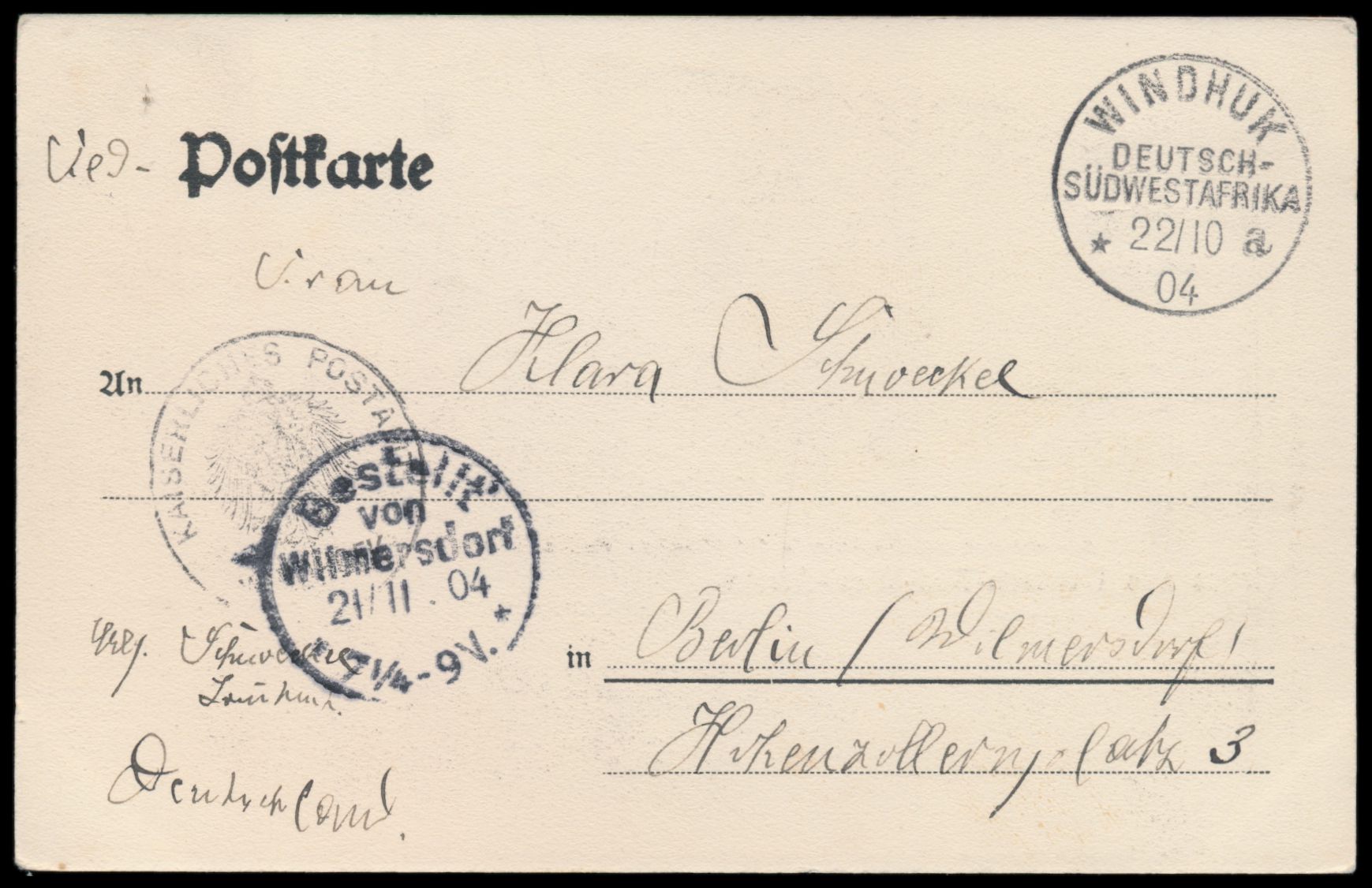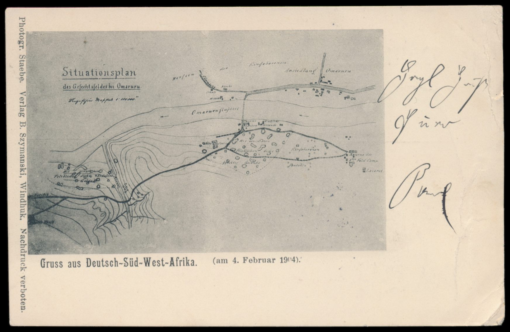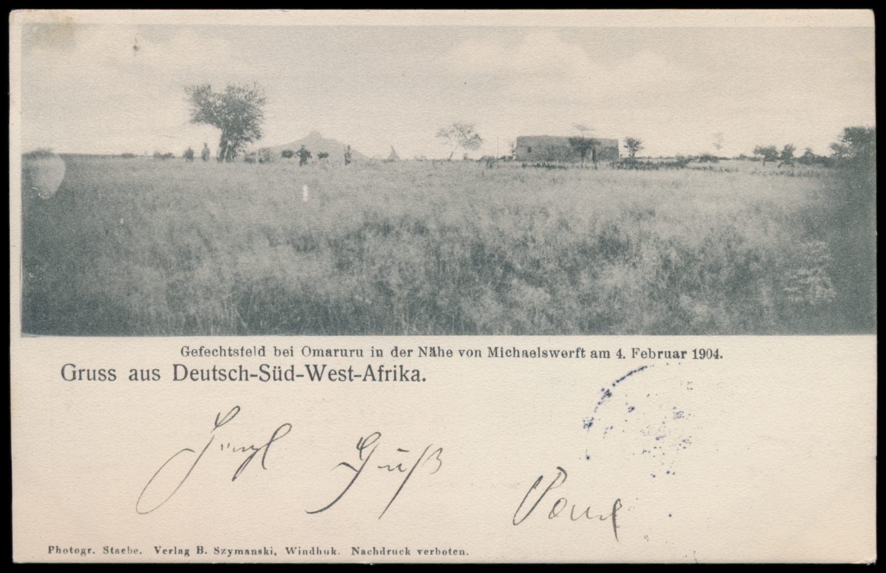 2 verschiedene Ansichtskarten Omaruru 4. Februar 1904 (Gefechtsfeld bzw. Situationsplan), Verlag B. Szymanski, Windhuk, beide mit Dienstsiegel "Kaiserliches Postamt Windhoek" und Stempel Windhuk a 22.10.04, nach Berlin, Ankunftstempel 21.11.04, jeweils Grußtext, 1 x kleiner Eckbug