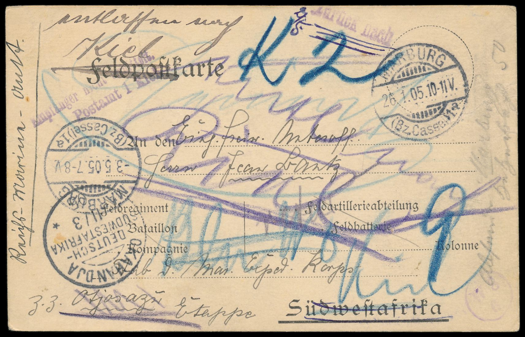 Feldpost-Vordruckkarte nach Südwestafrika , Vogenbeck FPK H-SWA Nr. 14.1, Stempel Marburg (Bz. Cassel) 1 26.1.05, an einen Unteroffizier beim Stab d. Marine-Expeditions-Korps in Otjosazu, Ankunftstempel Okahandja 11.3.05, handschriftlich "entlassen nach Kiel", zurück nach Kiel und von Kiel am 2.5.05 zurück nach Marburg, Ankunftstempel Marburg 3.5.05, Bedarf
