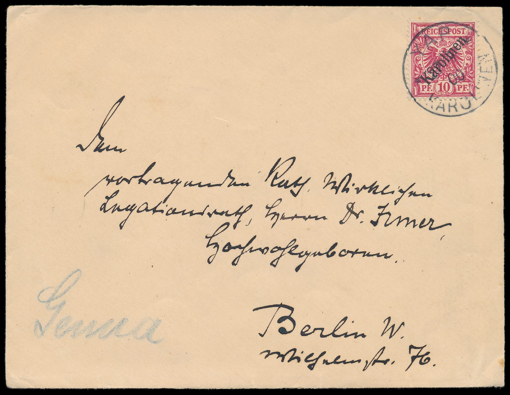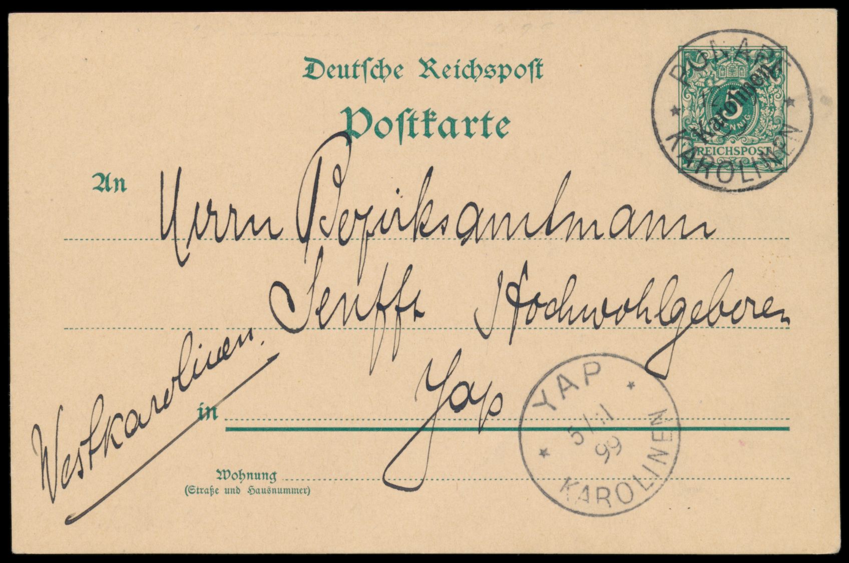 Ganzsache 5 Pf. mit Stempel Ponape 12.10.99, Tag der Übernahme in deutsche Verwaltung und Ersttag der Postagentur, an Bezirksamtmann Senfft auf Yap, Ankunftstempel Yap 5.11.99, frühestes mögliches Stempeldatum, ohne Text