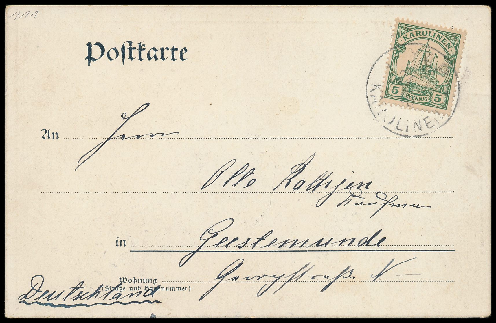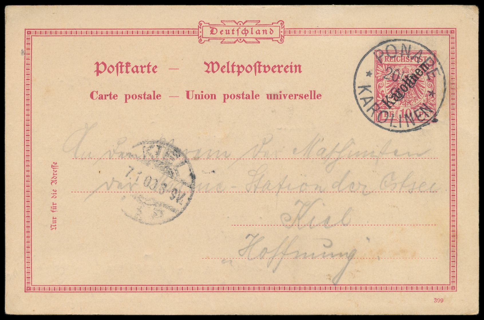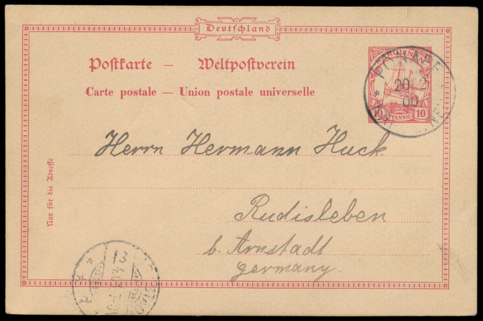 Ganzsache 10 Pf. mit Stempel Ponape 20.12.00 nach Deutschland, geschrieben in Ponape am 2.1.1901 von Arno Huck, Ankunftstempel Arnstadt 22.4.01, Bedarf. Sehr frühes Datum für die Verwendung der Schiffsausgabe.