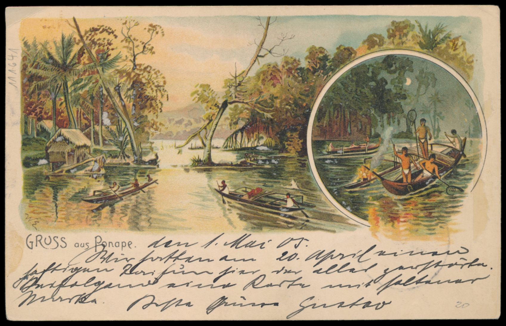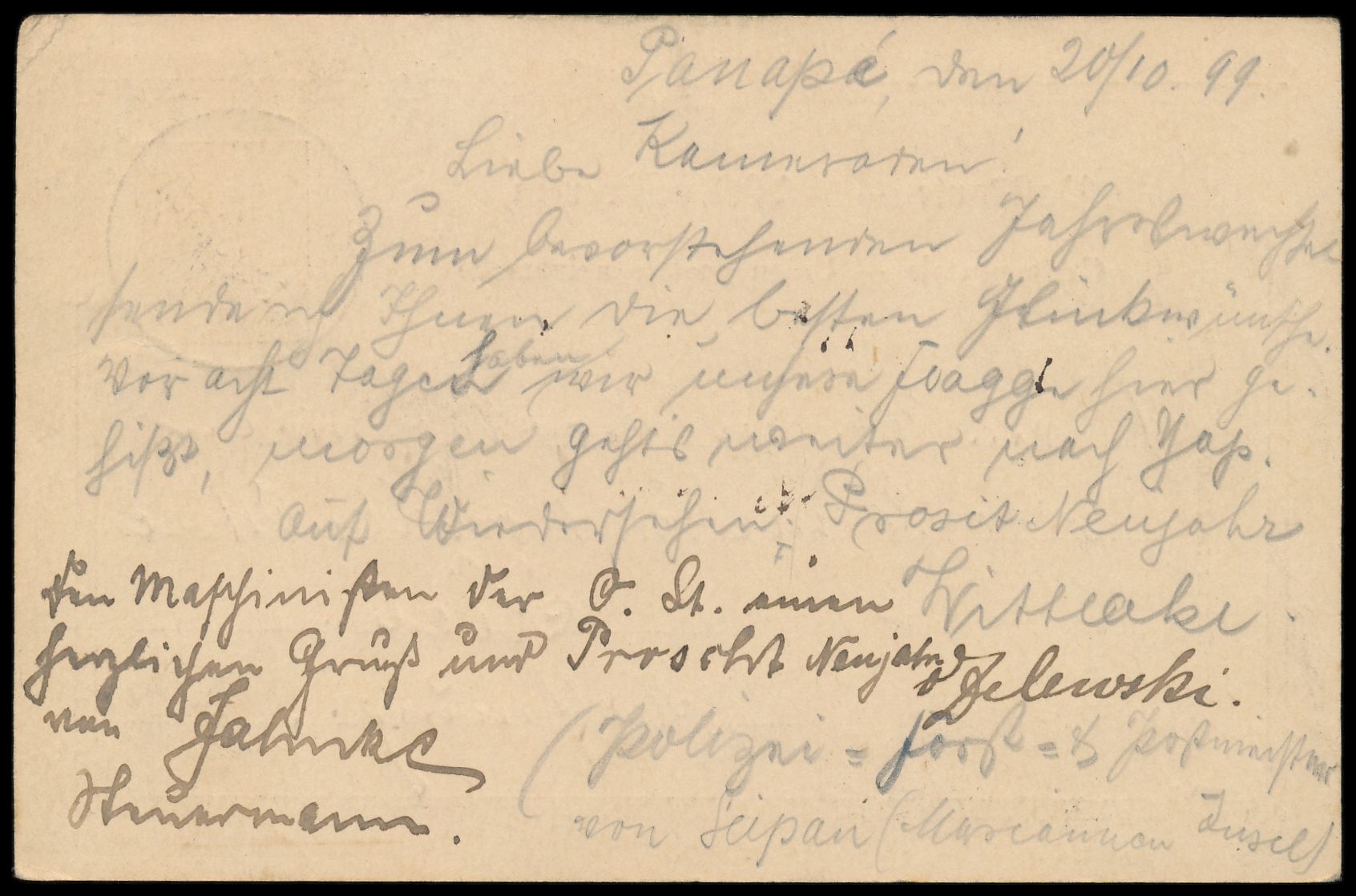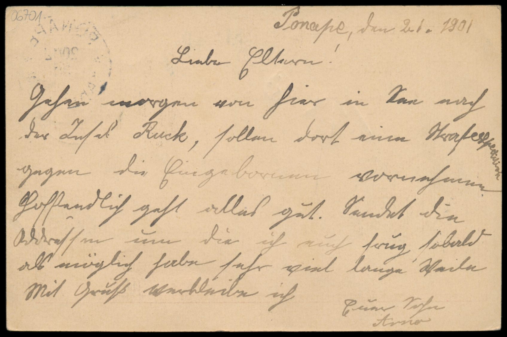 Ganzsache 10 Pf. mit Stempel Ponape 20.12.00 nach Deutschland, geschrieben in Ponape am 2.1.1901 von Arno Huck, Ankunftstempel Arnstadt 22.4.01, Bedarf. Sehr frühes Datum für die Verwendung der Schiffsausgabe.