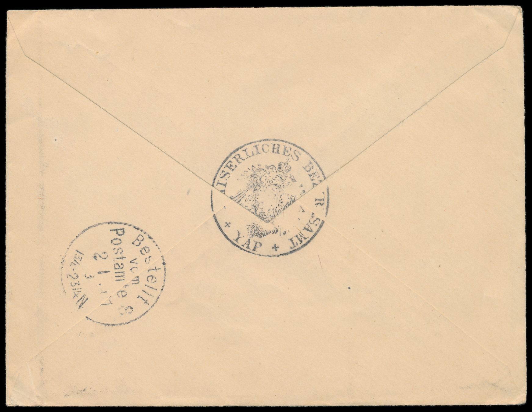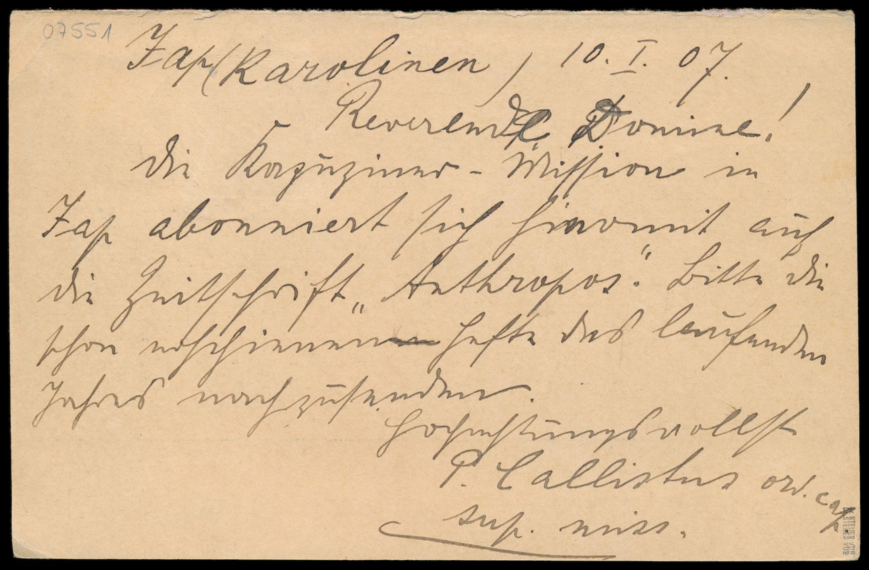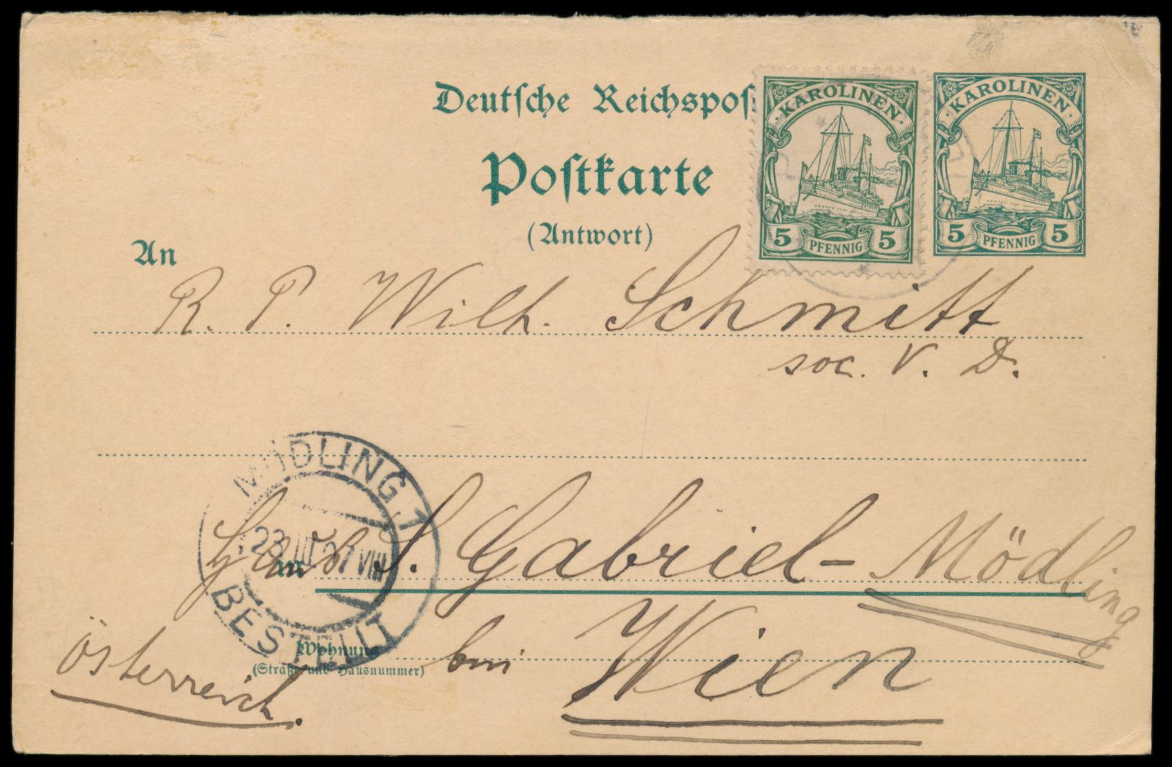 Ganzsachen-Antwortteil 5 Pf. mit Zusatzfrankatur 5 Pf. als Auslandskarte nach Österreich, etwas schwacher Stempel Yap , Ankunftsstempel Mödling 23.3.07, Absender ist P. Callistus von der Kapuziner-Mission, Bedarf, doppelt signiert Dr. Steuer VÖB