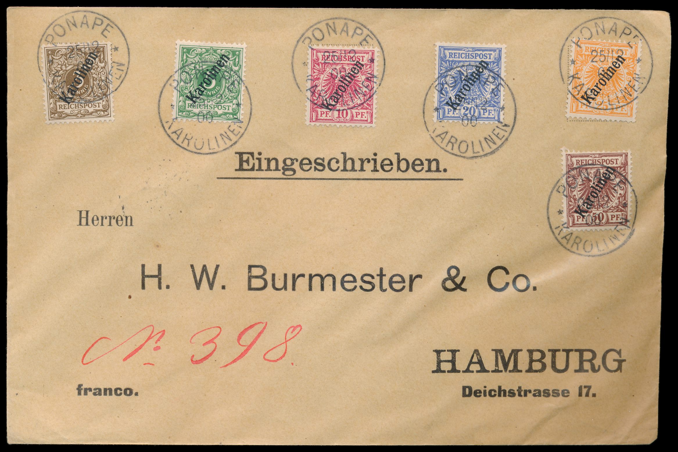 kompletter Aufdruck-Satz 3 bis 50 Pf. auf Einschreibbrief mit gedruckter Adresse nach Hamburg, Stempel Ponape 25.12.00, handschriftlicher Registriervermerk "No. 398" mit roter Tinte, Ankunftsstempel 22.4.00