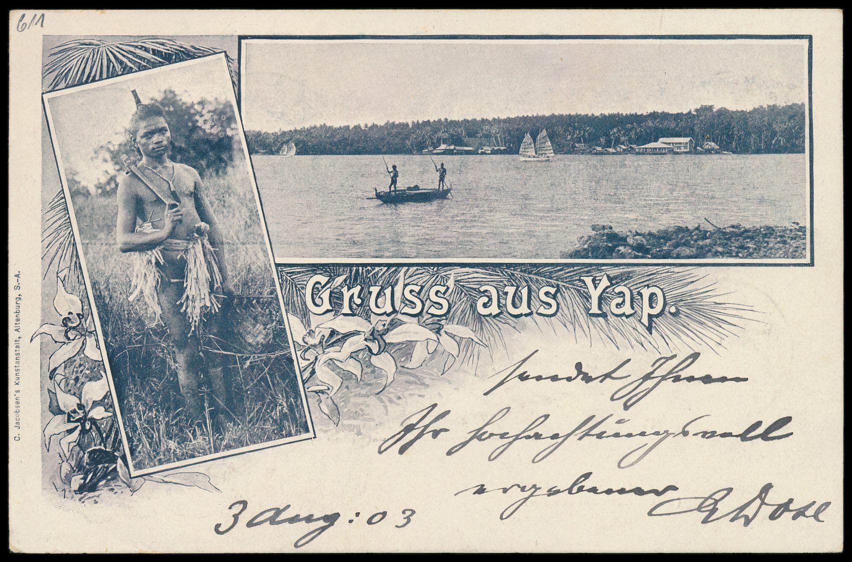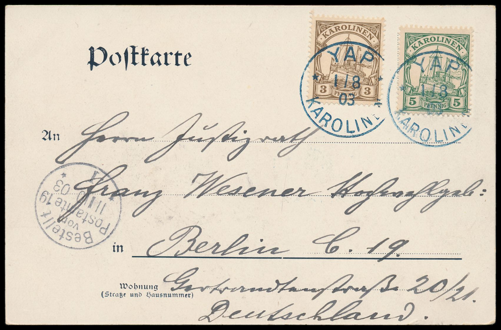 Zweibild-Ansichtskarte "Gruss aus Yap" - Eingeborener / Panorama von Yap, Frankatur 3 Pf. und 5 Pf., Stempel Yap 1.8.03, blaue Stempelfarbe, nach Geestemünde, Ankunftstempel 11.10.03, Bedarf