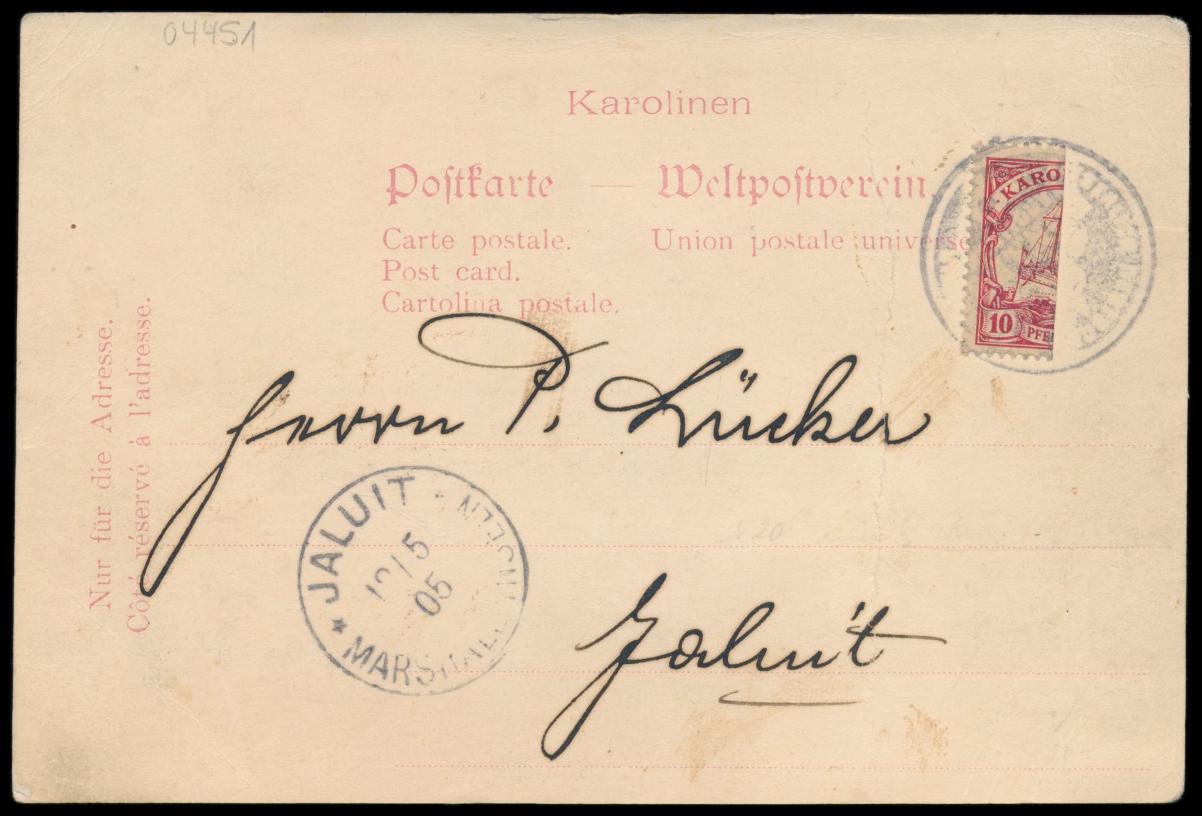 1905: 10 Pf. senkrecht halbiert (linke Hälfte) mit Dienstsiegel-Entwertung KDPAg Ponape auf Ansichtskarte nach Jaluit mit Ankunftstempel 1?.5.05, unauffälliger senkrechter Bug