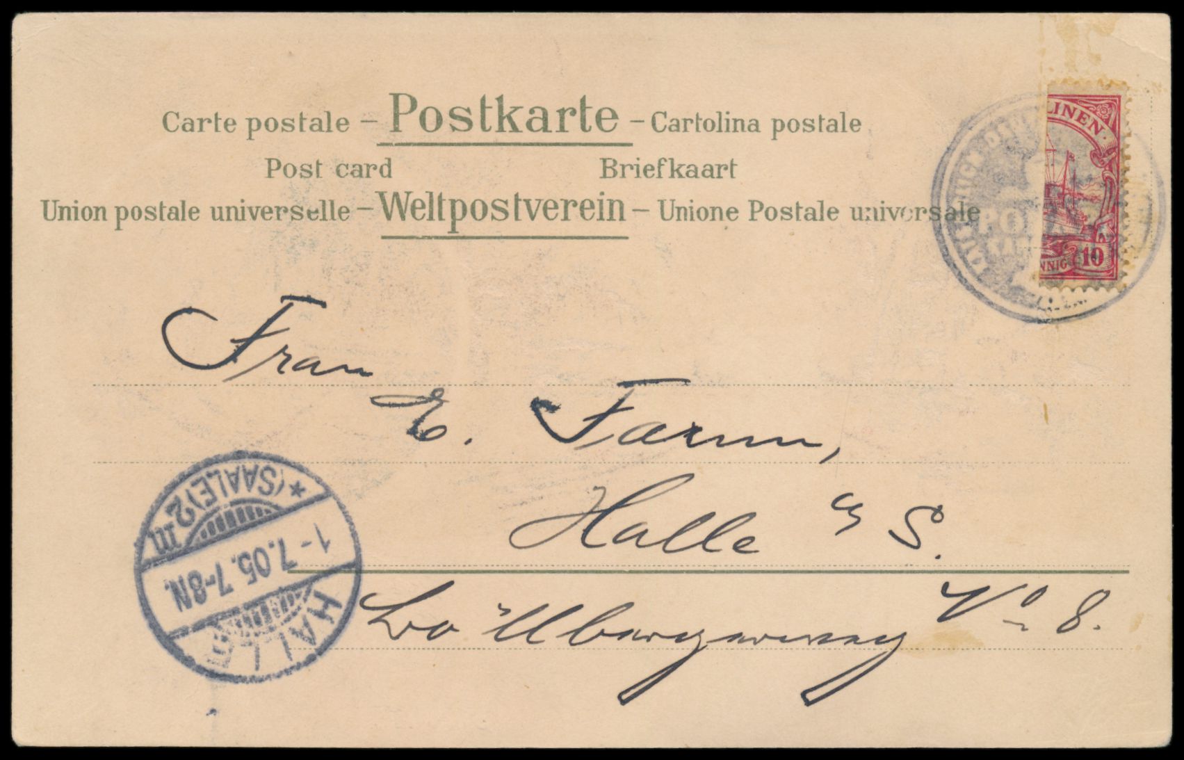 1905: Halbierung 10 Pf. (rechte Hälfte) mit Dienstsiegel-Entwertung KDPAg Ponape auf mehrfarbiger Ansichtskarte (Sturmschäden) nach Deutschland mit Ankunftstempel Halle (Saale) 1.7.1905, mit Text